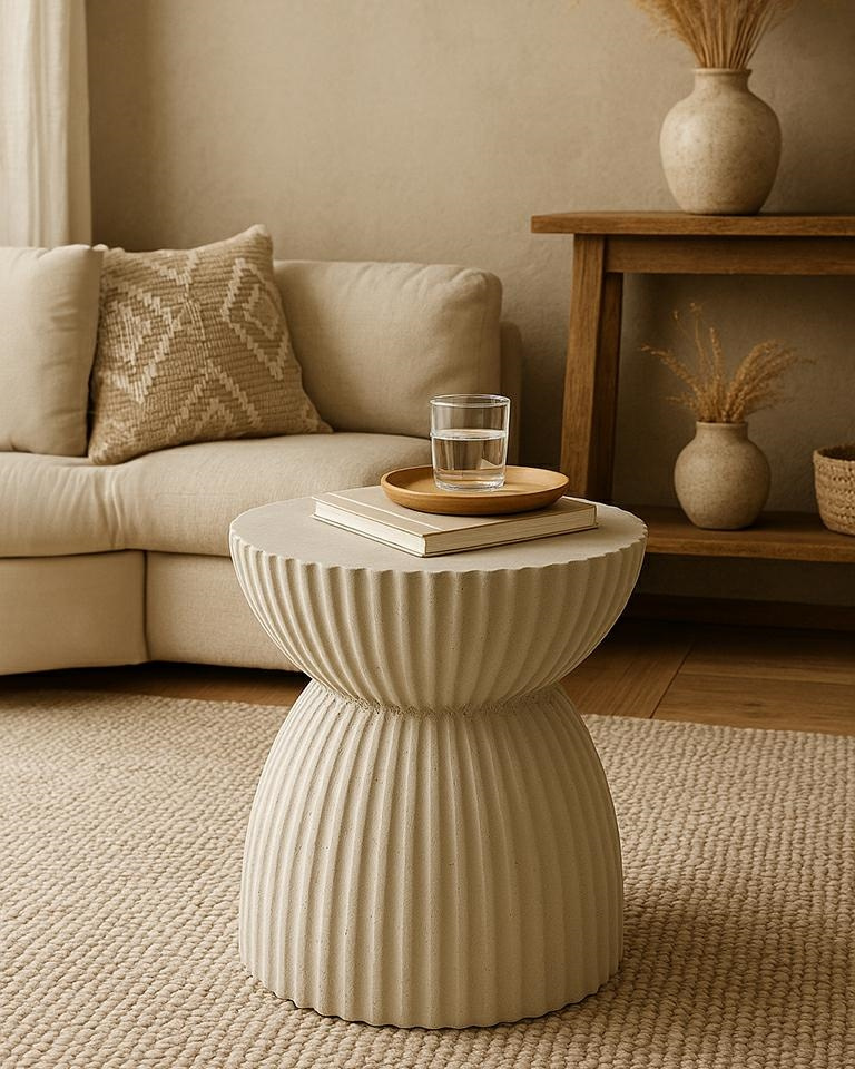 MaMaison stolik TURNO beżowy. Jeśli szukasz mebla, który nie tylko spełni praktyczną funkcję, ale również wprowadzi do wnętrza artystyczny akcent – stolik Turno spełni te oczekiwania w pełni. Wykonany z MDF, zachwyca swoją formą inspirowaną rzeźbą i delikatną, beżową kolorystyką. Charakterystyczne, pionowe żłobienia nadają mu wyrazistej tekstury, a zwężenie w centralnej części dodaje lekkości i finezji. Turno to idealny wybór do wnętrz, w których liczy się detal i stylowe wykończenie. Może pełnić rolę stolika pomocniczego, nocnego lub efektownego elementu dekoracyjnego. Doskonale wpisuje się w trendy organicznych kształtów i stonowanej palety barw. Wymiary: wys. 45,5 cm / szer. 36 cm / gł. 36 cm Waga brutto: 13 kg.