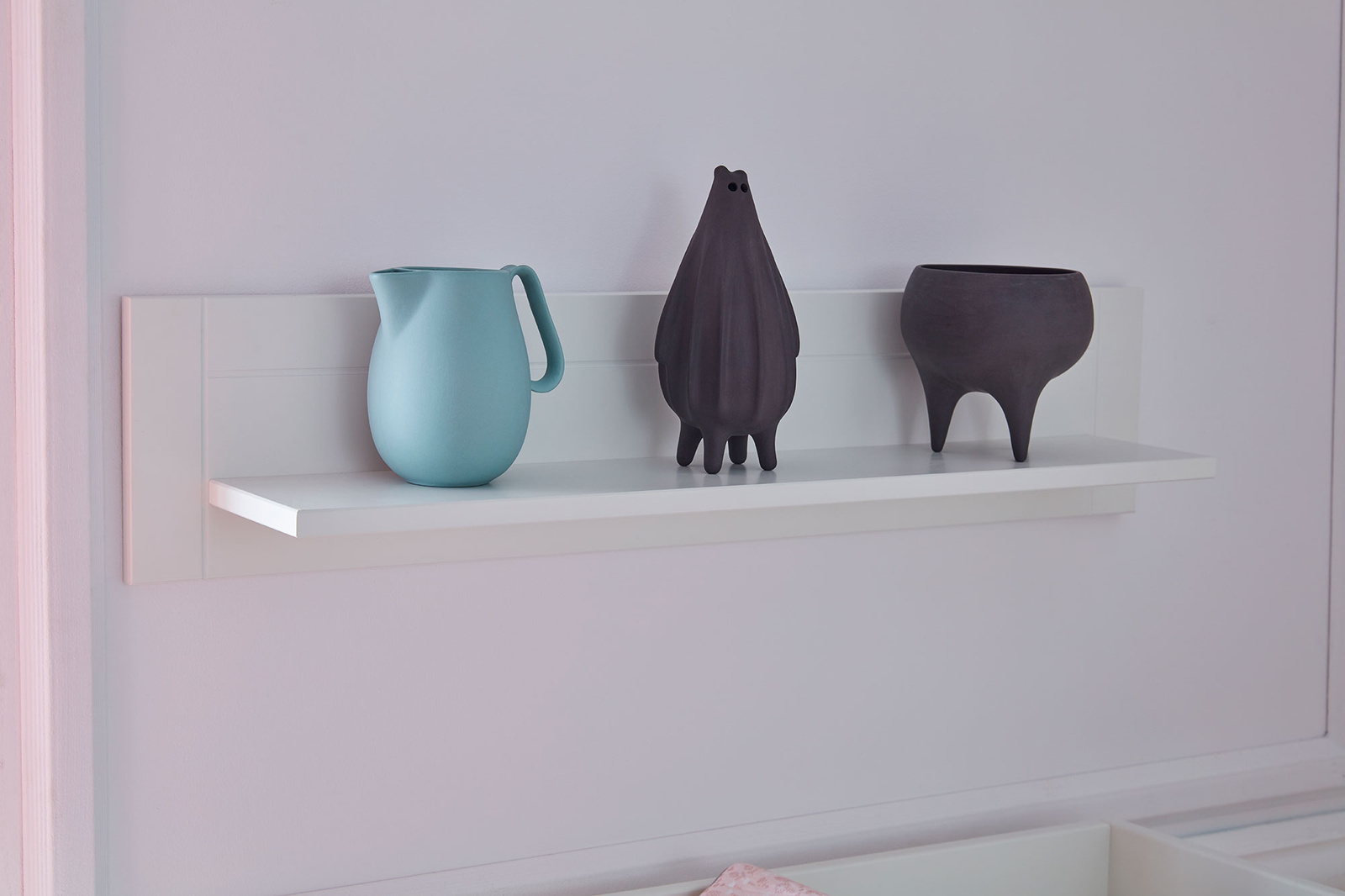 Maksymalne obciążenie półki to 5 kg, zawiesia są z regulacją mimośrodową. W komplecie okuć brak kołków rozporowych do montażu do ściany (należy je dobrać odpowiednio do rodzaju ścian).