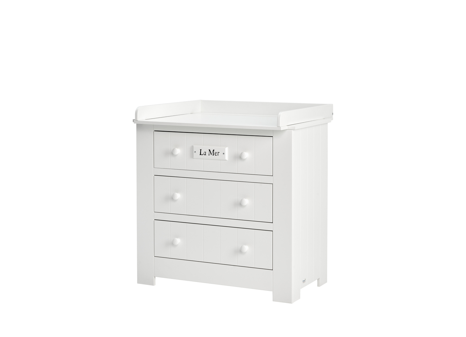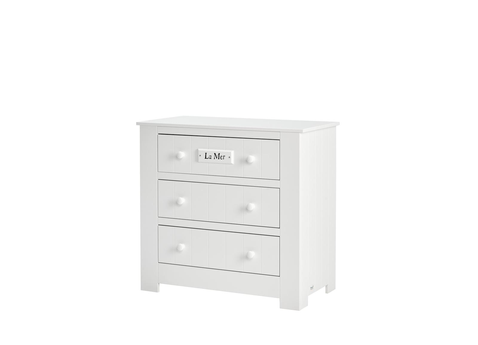 Komoda posiada dekor La Mer (fr. morze). Występuje w kolorze białym. Pasuje zarówno do pokoiku chłopca, jak i dziewczynki. Produkt do samodzielnego montażu. Do komody można dokupić demontowalną nakładkę do przewijania.