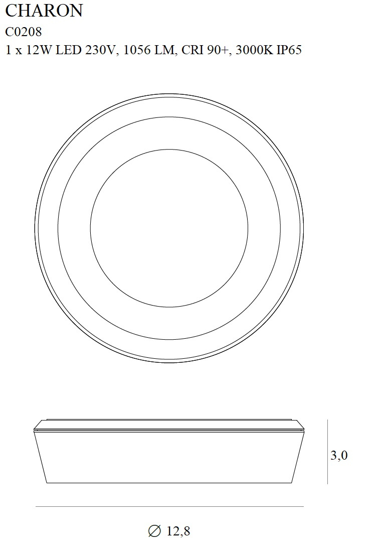 - Moc/Power: 1 x 12W LED 230V, 1056 LM, CRI 90+, 3000K, IP65