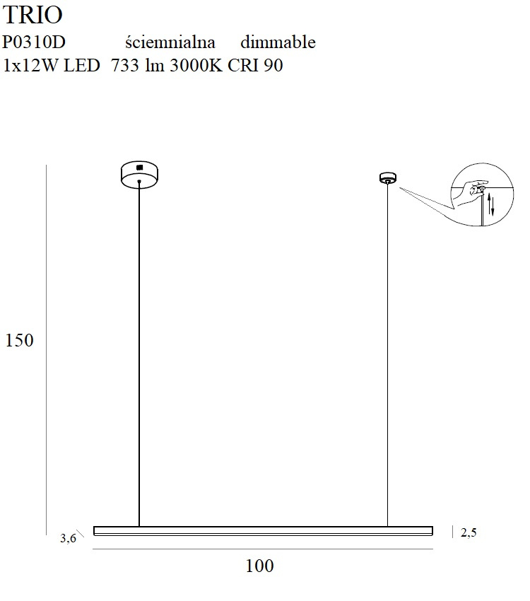 - Moc/Power: 1 x 12W LED 230V, 733 LM, CRI90 3000K