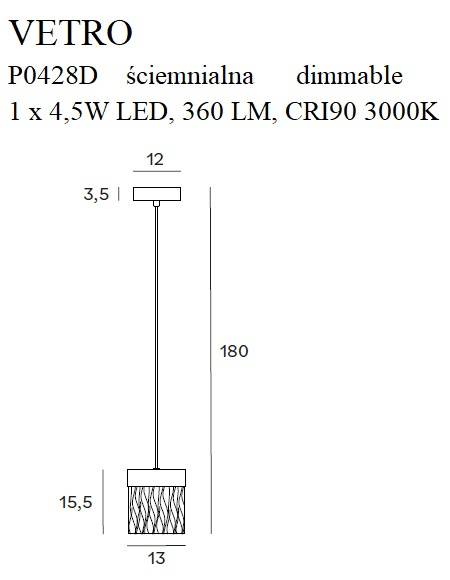 - Moc/Power: 1 x 4,5W LED 230V, 360 LM, CRI 90, 3000K