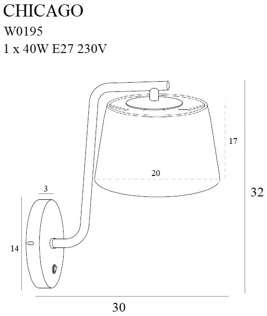 - W: 20 cm, D: 30 cm, H: 32 cm, abażur Ø: 16-20 cm