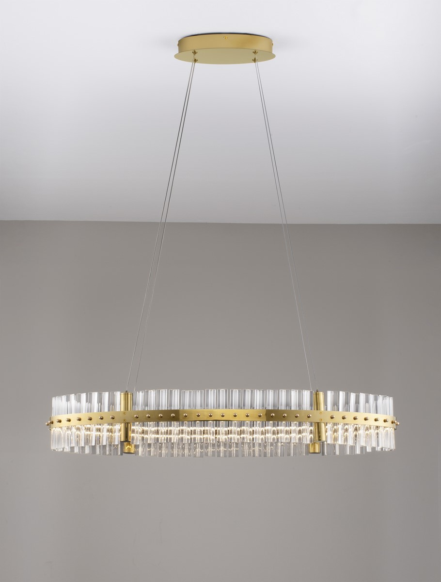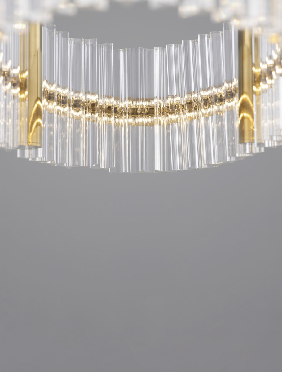 • MAYO to nowoczesna, elegancka lampa wisząca w stylu glamour, klasyczynym. Wykonana z najwyższej jakości metalu i szkła, ma wysokość 130 cm i aż 90 cm szerokości. Lampa w odcieniach platynowego złota. Perfekcyjnie wpasowuje się w aranżacje w sypialni oraz