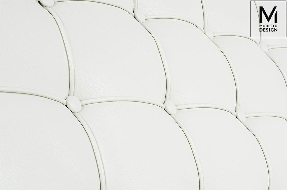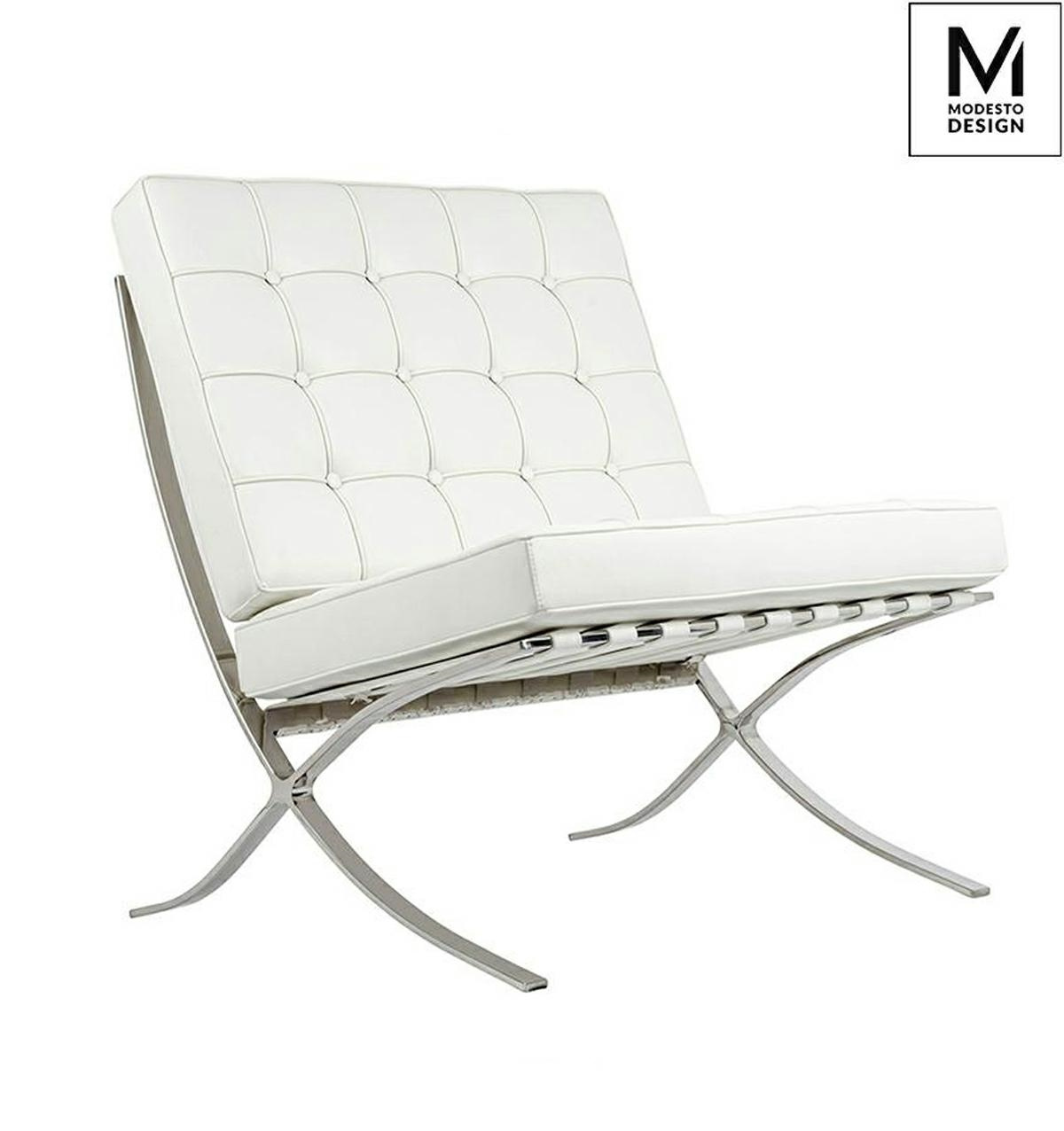 - Fotel Barcelon marki Modesto Design stanowi jednoosobową mini sofę, której szerokość 75 cm pozwala wygodnie się rozsiąść i wypocząć. Siedzisko jest na wysokości 46 cm i zostało wykonane w całości z ekoskóry w kolorze białym. Z kolei stelaż i nóżki fotela