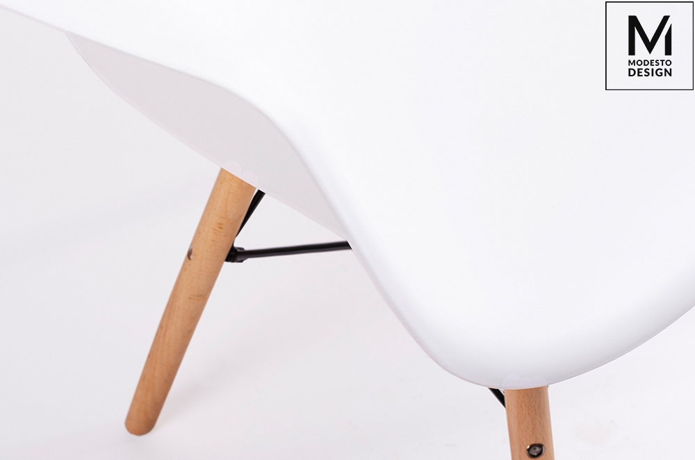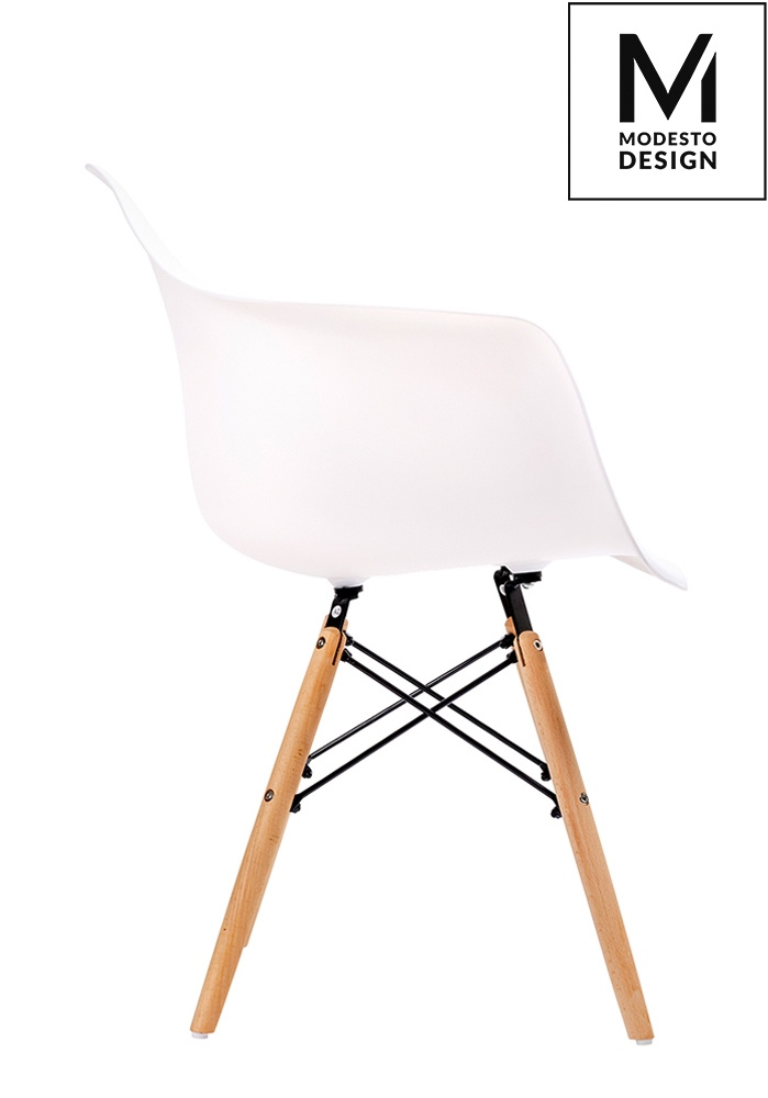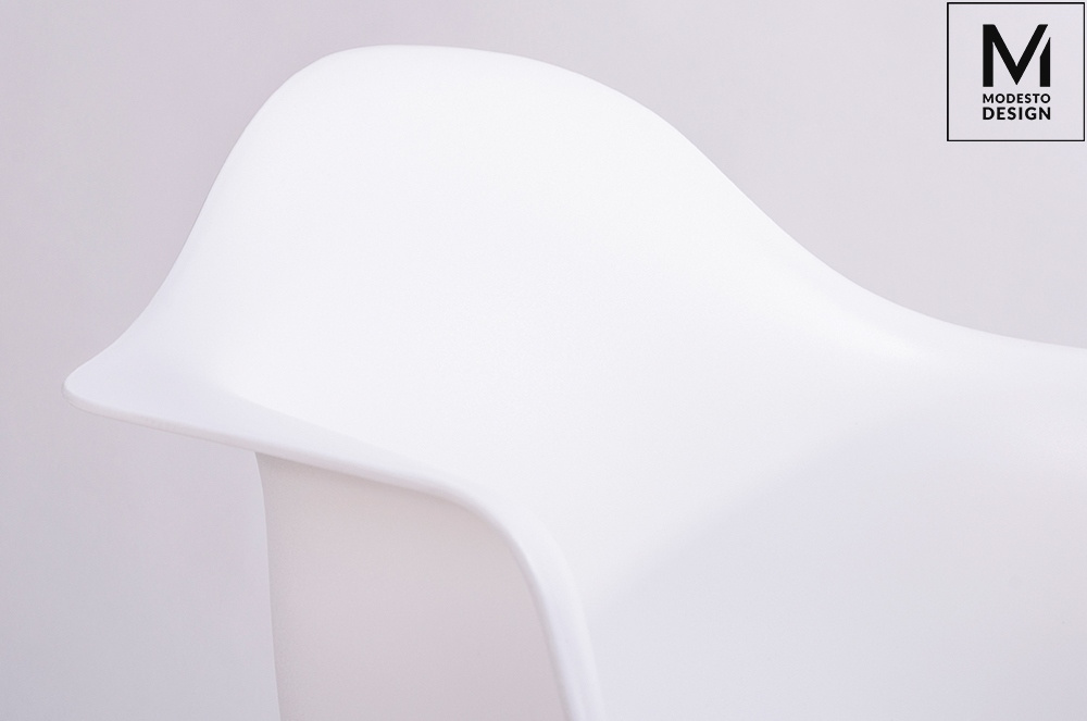 - Fotel DAW DSW marki MODESTO DESIGN. Siedzisko w całości zostało wykonane z polipropylenu w kolorze białym matowy. Łączenia ze stali w kolorze czarnym. Nogi z drewna bukowego. Wygodny fotel który, dzięki zaostosowaniu tworzywa sztucznego jest łatwy w czysz
