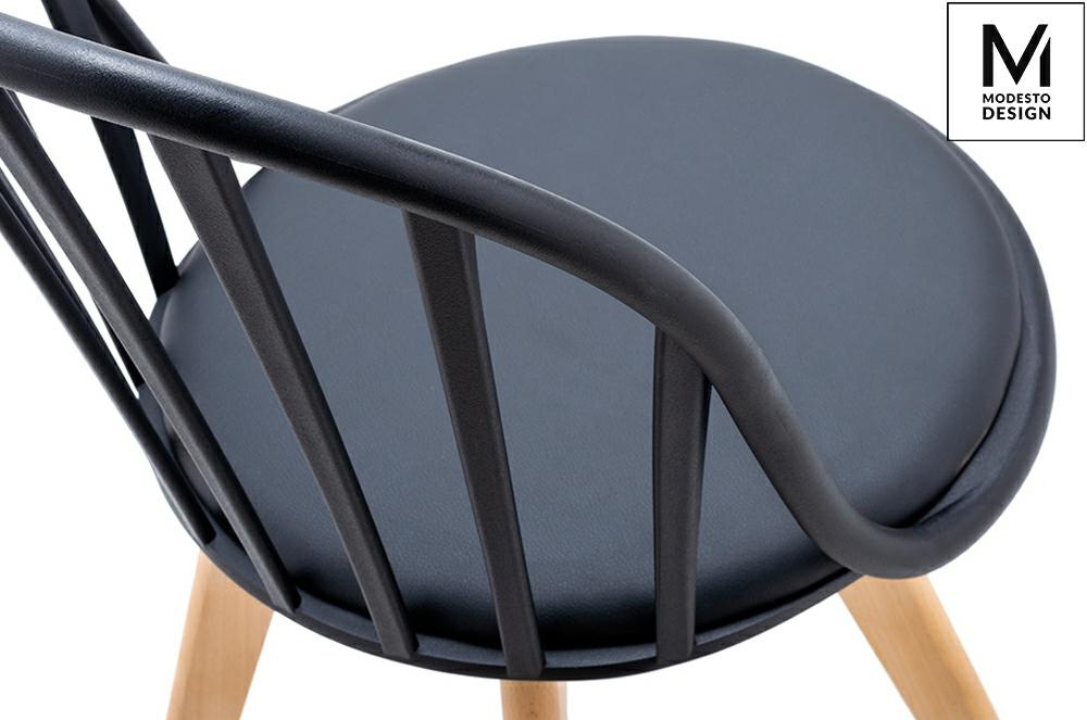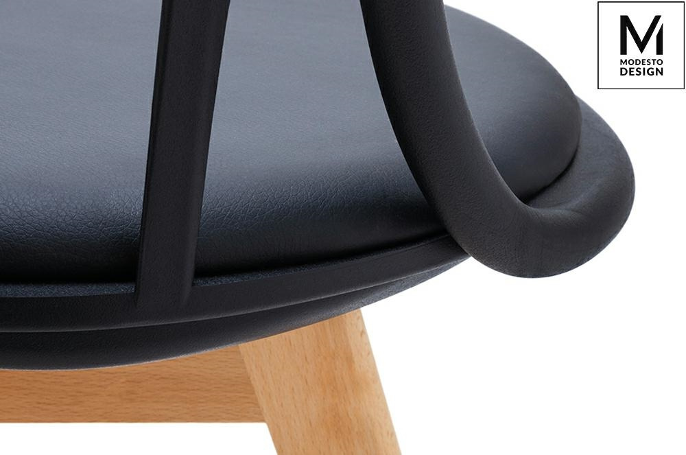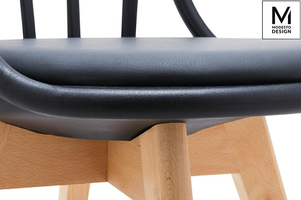 - Krzesło ALBERT marki MODESTO DESIGN. Klasyczne krzesło w nowoczesnym wydaniu. Konstrukcja wykonana z polipropylenu w kolorze czarnym matowym. Na siedzisku znajduje się miękka poduszka, tapicerowana czarną ekoskórą. Podstawa wykona z naturalnego drewna buk