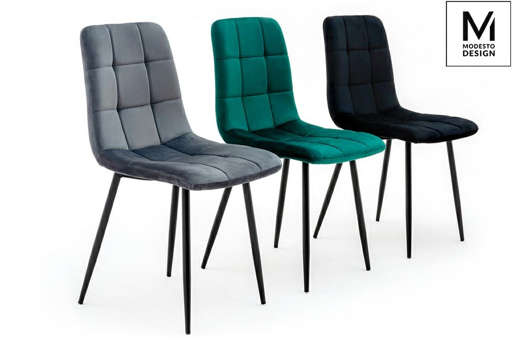 - Krzesło CARLO w kolorze ciemny szary od MODESTO DESIGN. Prosta i funkcjonalna forma, łącząca w sobie modną pikowaną tkaninę i metalowe nogi. Wyprofilowane oparcie i miękkie siedzisko zapewniają komfortowe użytkowanie. Całość tapicerowana jest modnym i prz