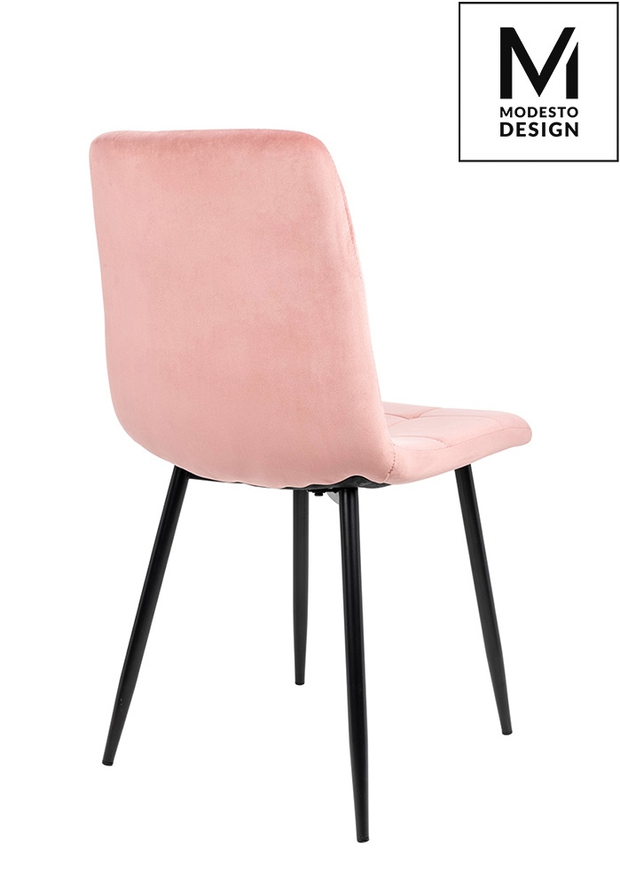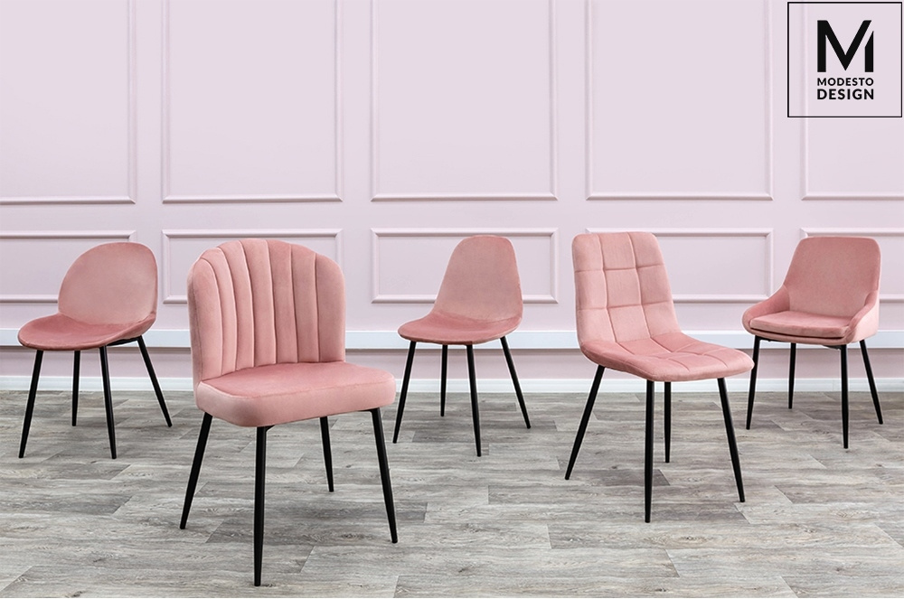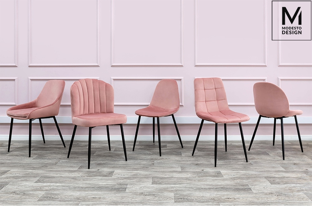 - Krzesło CARLO w kolorze pudrowy róż od MODESTO DESIGN. Prosta i funkcjonalna forma, łącząca w sobie modną pikowaną tkaninę i metalowe nogi. Wyprofilowane oparcie i miękkie siedzisko zapewniają komfortowe użytkowanie. Całość tapicerowana jest modnym i przy