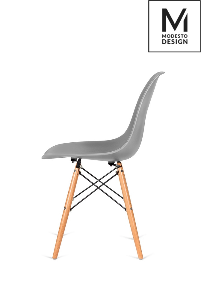 - Krzesło DSW marki MODESTO DESIGN. Siedzisko i oparcie wykonane z tworzywa sztucznego w kolorze szarym. Nogi drewno bukowe, łączenia stal lakierowana na czarno. Wymiary: wys. 82 cm / szer. 46 cm / gł. 48 cm Waga netto: 3.50 kg Wymiary opakowania: 58 cm / 5