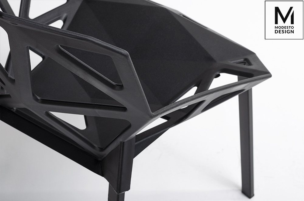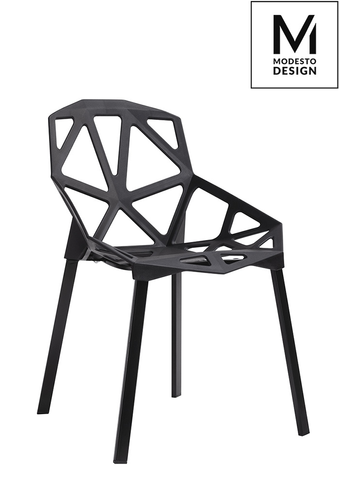 - Krzesło SPLIT MAT marki MODESTO DESIGN. Siedzisko i oparcie wykonane jest z polipropylenu w kolorze czarnym matowym. Podstawa wykonana z metalu lakierowanego na kolor czarny. Wymiary: wys. 81 cm / szer. 55 cm / gł. 59 cm Siedzisko: wys. 45 cm Waga netto: