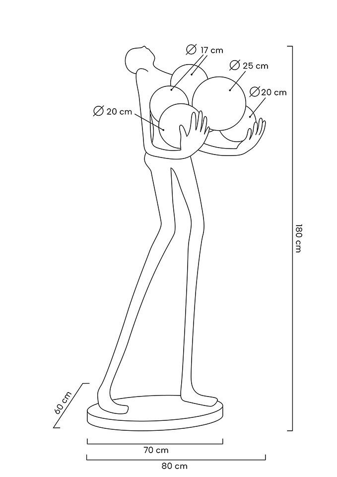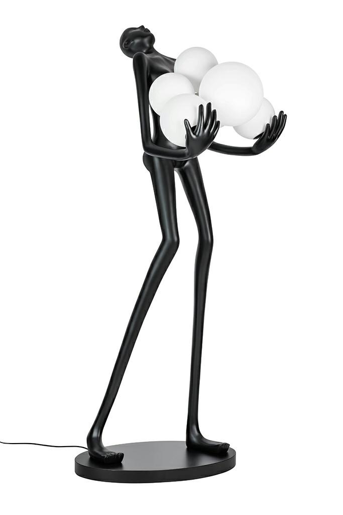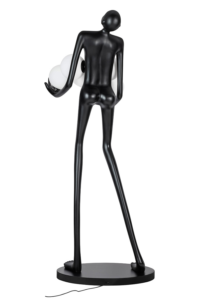 - Lampa podłogowa HUMAN. Wykonana z włókna szklanego w kolorze czarnym z sześcioma białymi kloszami w różnych rozmiarach. Stworzony kontrast kolorystyczny idealnie współgra z jej oryginalnym kształtem. Sylwetka człowieka utrzymująca ciężar światła staje się