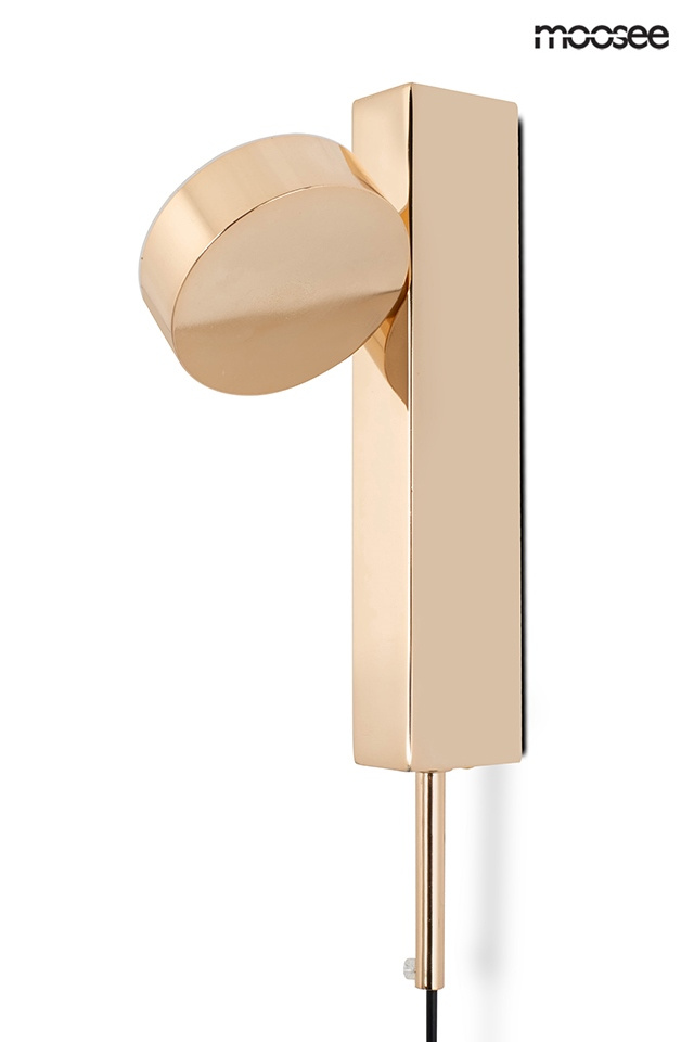 - MOOSEE lampa ścienna CLARID GOLD złota. Wykonana z aluminium i stali w kolorze złotym z wbudowanym źródłem światła. Klosz jest regulowany, dzięki czemu możemy kierować strumień światła w pożądanym przez nas kierunku. W dolnej, okrągłej części oprawy zosta
