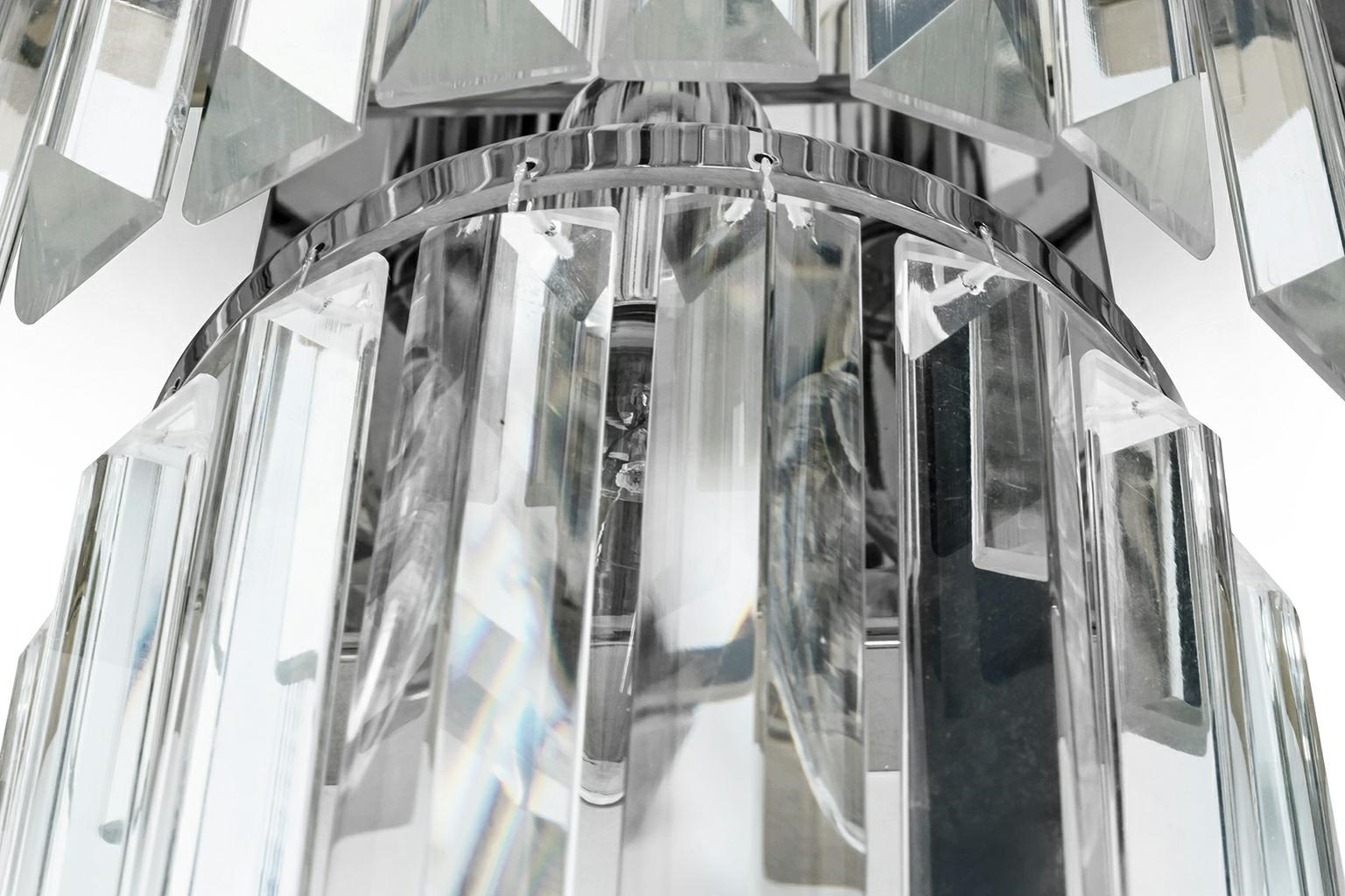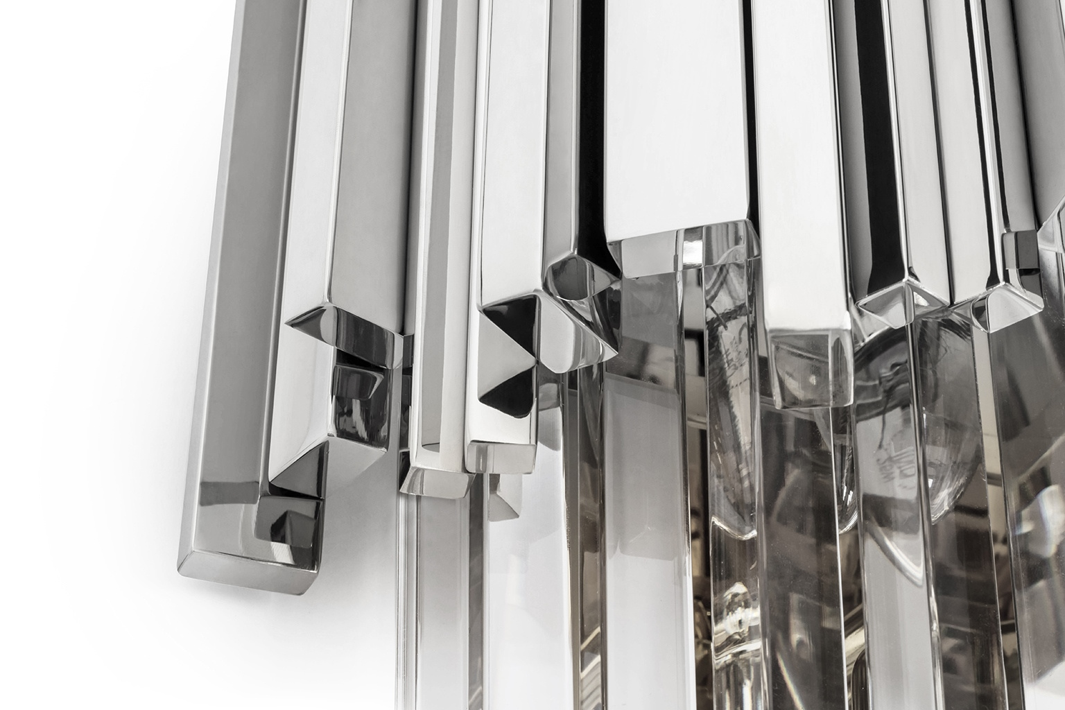 - MOOSEE lampa ścienna lmperial Wall Silver. Elegancka osłona klosza wykonana została ze stali szczotkowanej w srebrnym kolorze. Wewnątrz zawieszone są kryształki, które skrywają źródło światła. Całość zamocowana jest na srebrnej ramce. Półokrągły kształt k