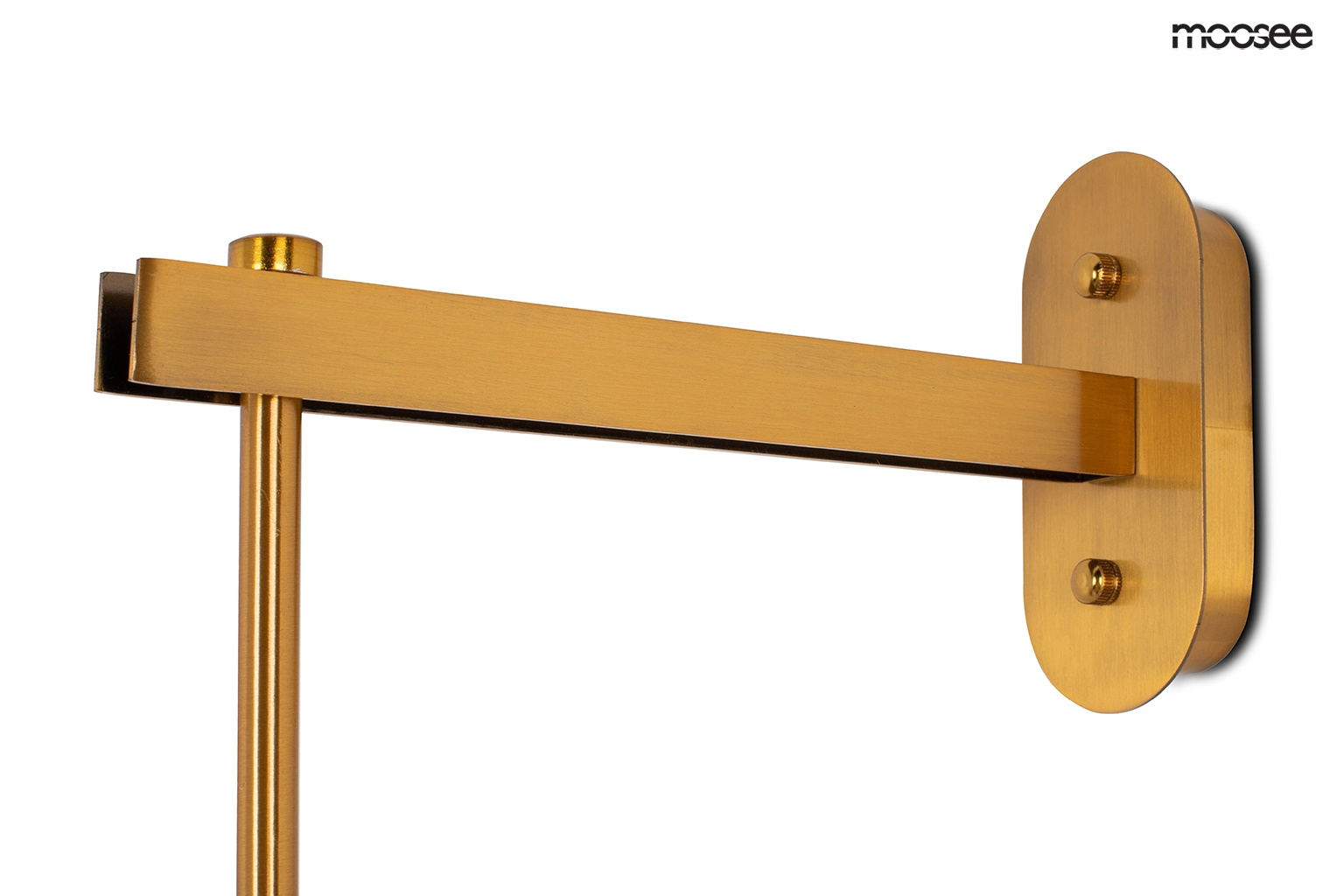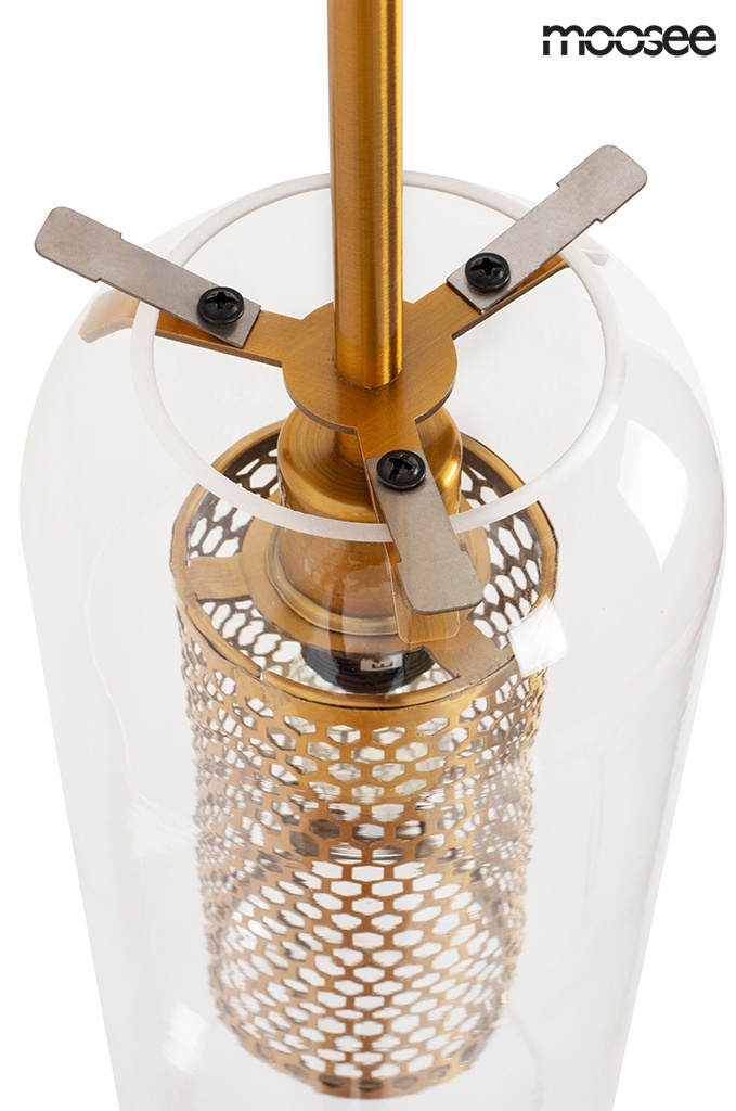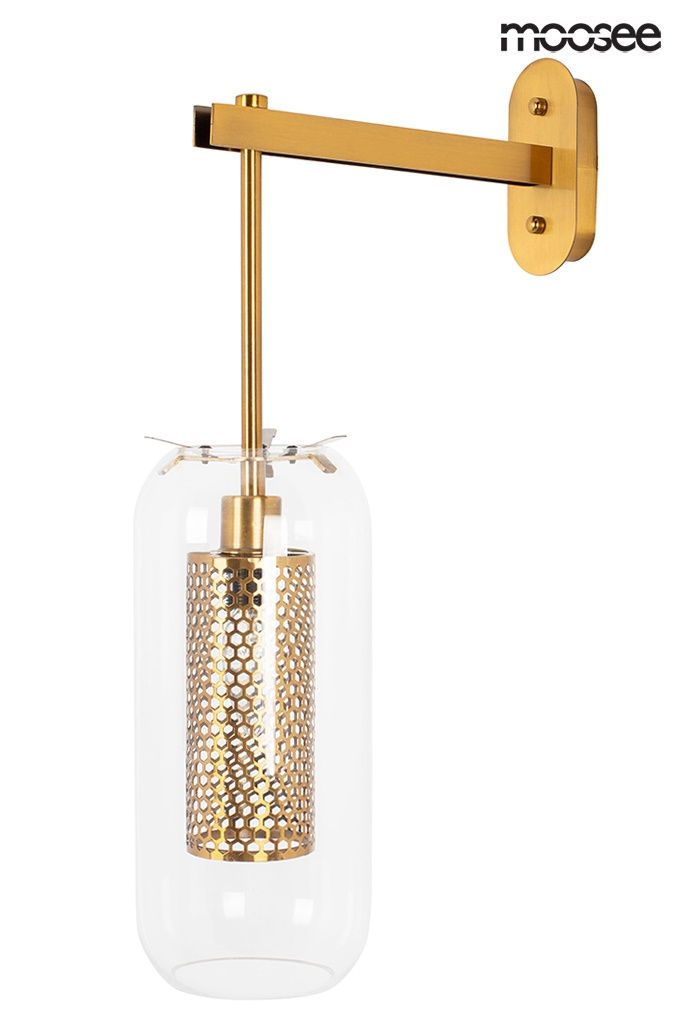 - MOOSEE lampa ścienna LAMPION złota. Kinkiet wyglądem przypomina elegancki lampion, który został wykonany z połączenia stali w kolorze złotym oraz transparentnego szklanego klosza. Ażurowe wykończenie wnętrza oprawy w ciekawy sposób rozprasza ciepłe światł