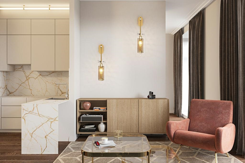 Kinkiet wyglądem przypomina elegancki lampion, który został wykonany z połączenia stali w kolorze złotym oraz transparentnego szklanego klosza.