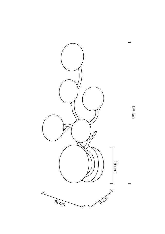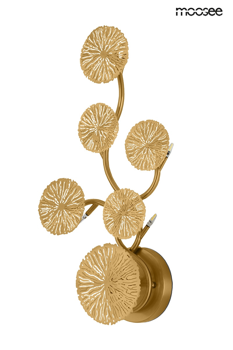 - MOOSEE lampa ścienna LIRIO 6 złota. Szykowna, nowoczesna oprawa, która doskonale sprawdzi się w roli dekoracji. Unikalny design tworzy 6 stalowych kół o różnych rozmiarach, wykończonych w złotym kolorze. Dzięki ozdobnym wycięciom światło przenika, tworząc