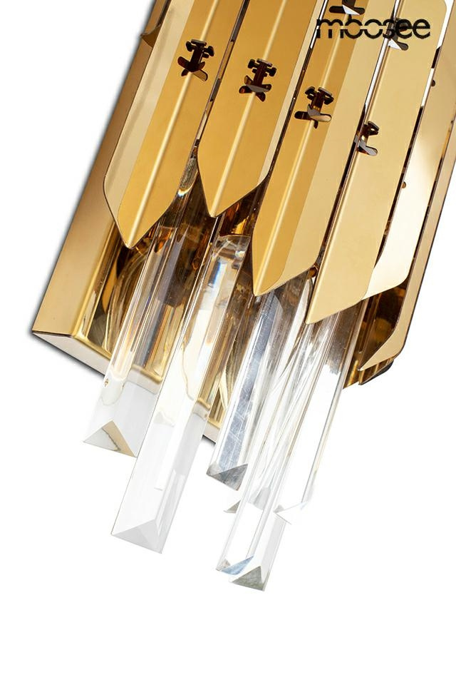 - MOOSEE lampa ścienna MAJESTIC złota. Niezwykle luksusowe i eleganckie oświetlenie nawiązujące do pałacowego stylu. Innowacyjnym zdobieniem jest najwyższa warstwa wykonana z połyskującej stali w kolorze złotym. Kaskadowo nachodzące na siebie warstwy kryszt