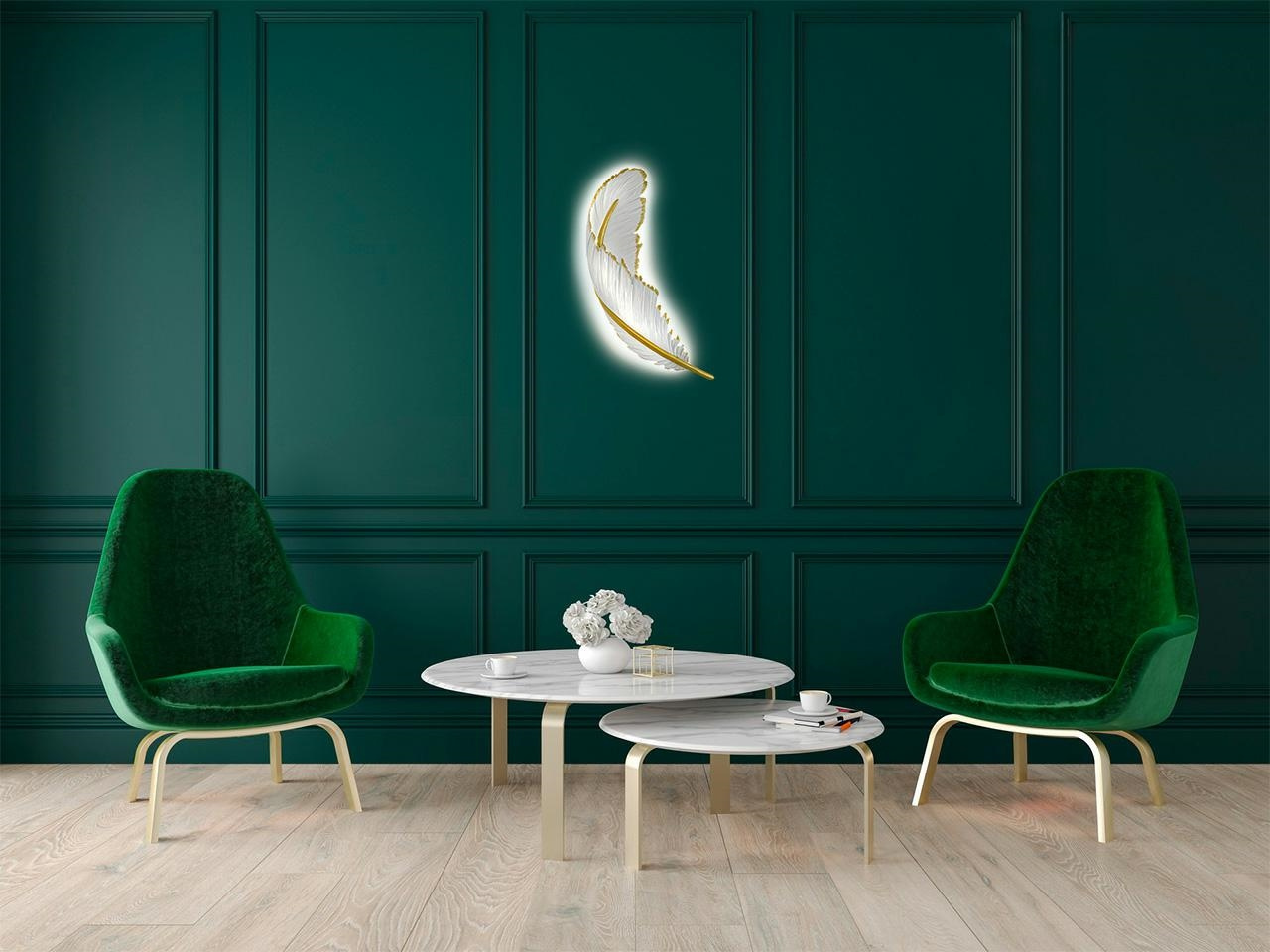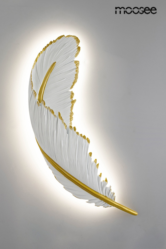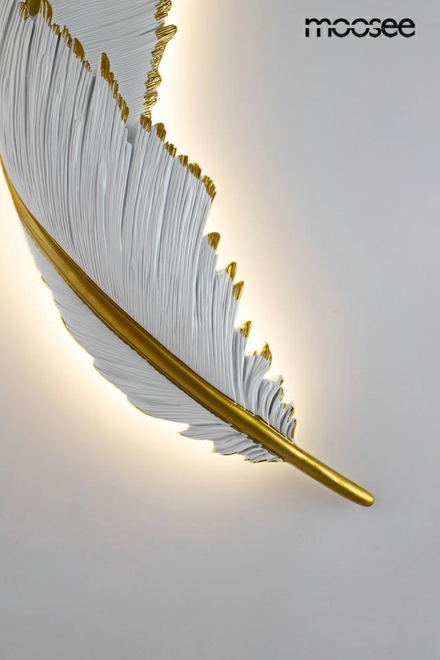 - MOOSEE lampa ścienna PIÓRKO. Ten niezwykle efektowny kinkiet został zainspirowany pięknym, lekkim piórem o nieskazitelnym wyglądzie. Całość ręcznie pomalowano i wykończono w kolorystyce biało-złotej, w żywicy. Zarówno użyty materiał, jak i forma lampy spr