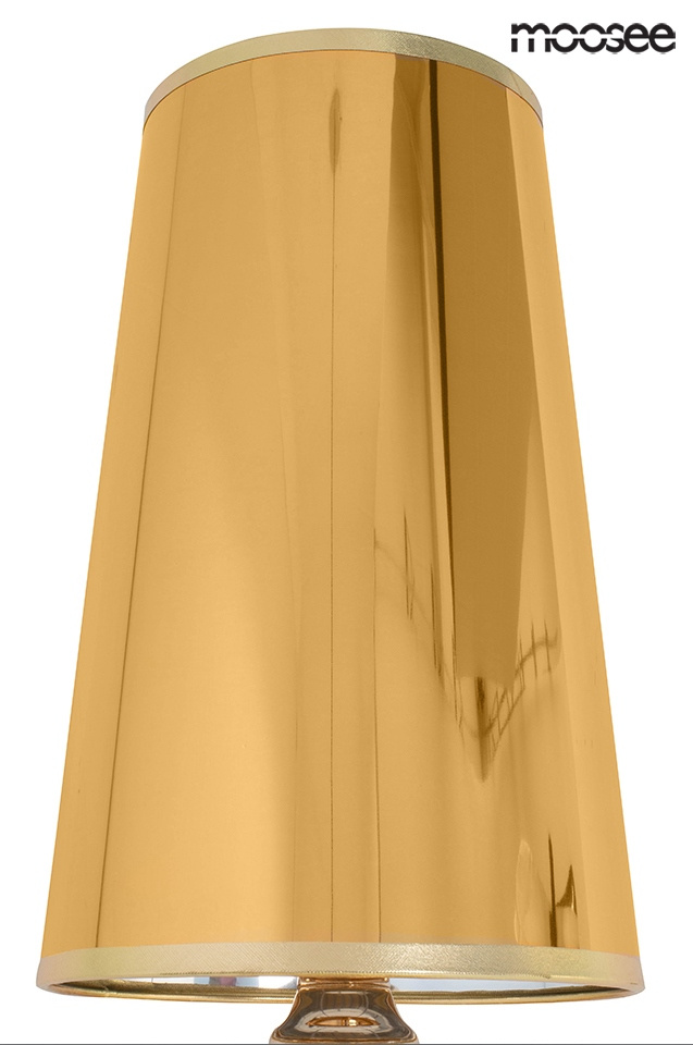 - MOOSEE lampa ścienna QUEEN 15 złota. Nowoczesna, a zarazem minimalistyczna propozycja oświetlenia. Gładki abażur został wykonany z tworzywa sztucznego, a stelaż lampy uformowano z aluminium w lustrzanym połysku. Prostota designu powoduje, że sprawdzi się