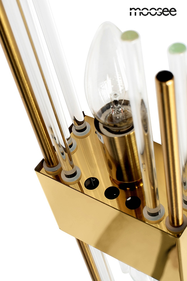 - MOOSEE lampa ścienna SLANT złota. Efektowna oprawa wykonana z metalu i szkła w stylowym, złotym odcieniu. Transparentne klosze ułożone po skosie tworzą ciekawy efekt wizualny. Slant świetnie sprawdzi się w klasycznych i nowoczesnych wnętrzach. Światło: 2