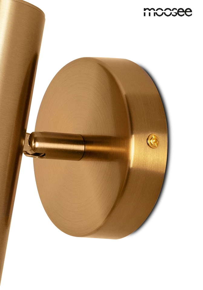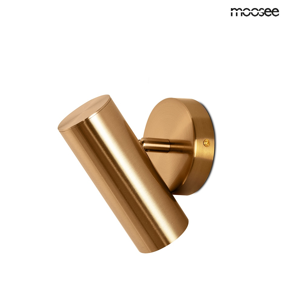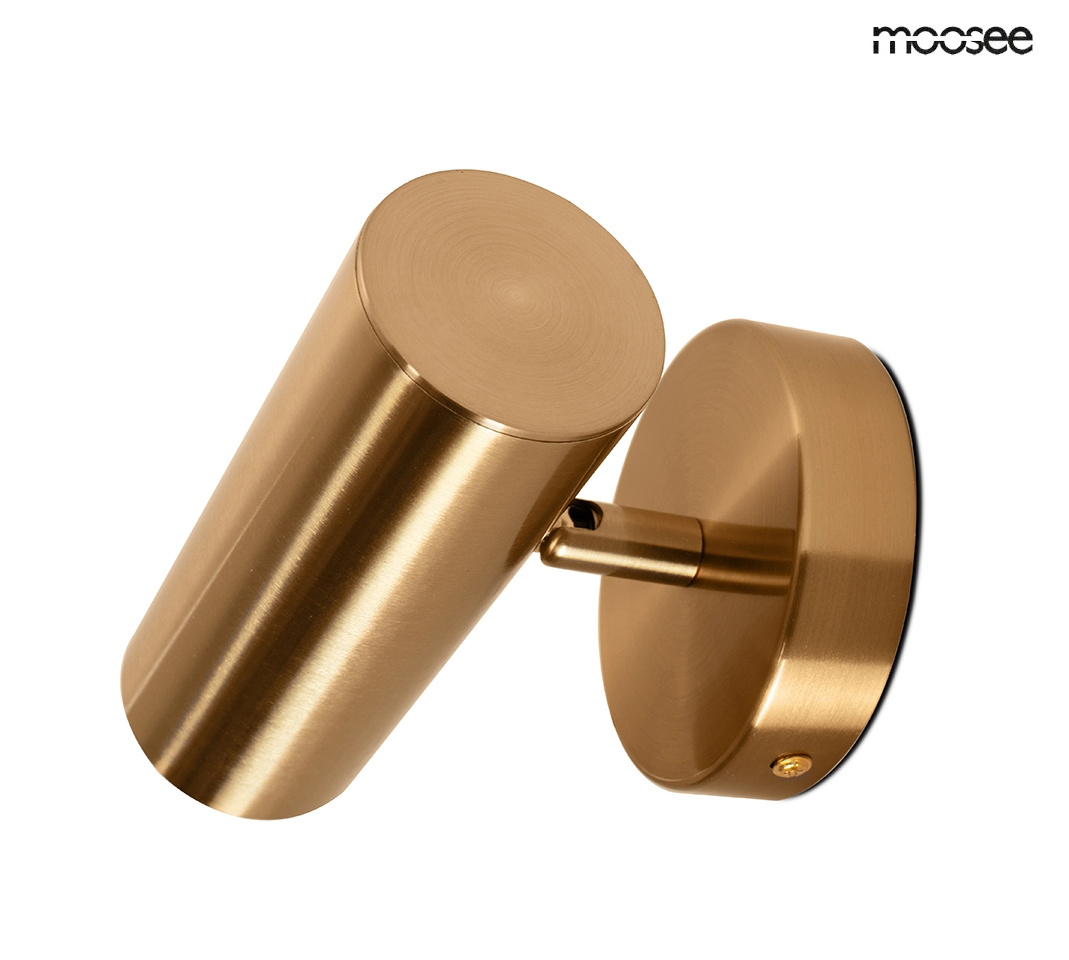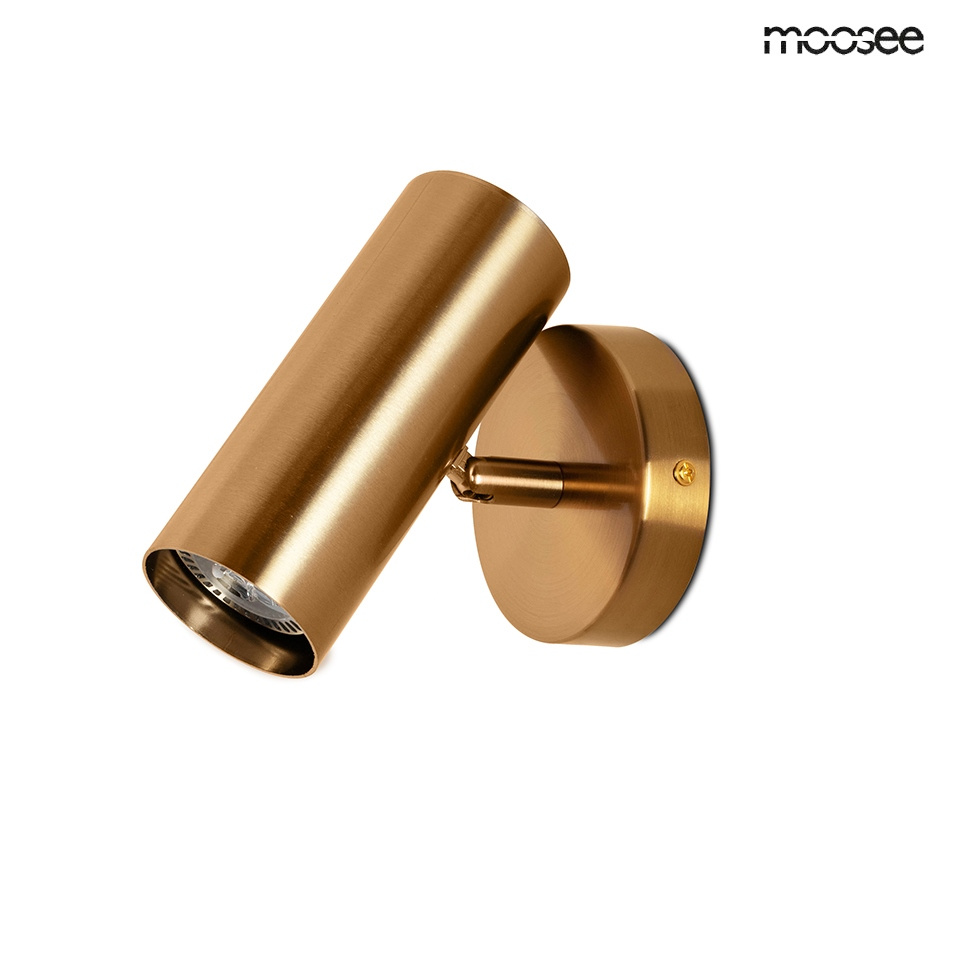- MOOSEE lampa ścienna SPOT złota. Kinkiet wykonany ze stali i aluminium w kolorze złotym. Posiada regulację klosza, dzięki czemu możemy kierować strumień światła w pożądanym przez nas kierunku. Światło: GU10 max. 40 W (brak w zestawie) Wymiary: wys. 15,5 c
