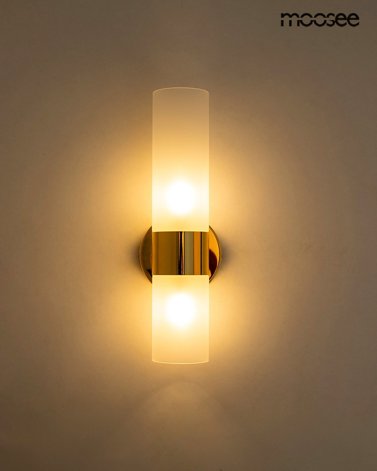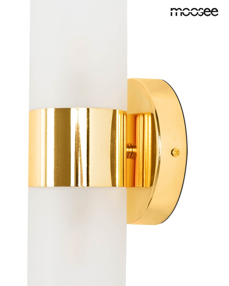 - MOOSEE lampa ścienna TUBS złota. Tubs to wyrafinowane połączenie klasyki z nowoczesnym designem, prezentujące się w efektownym, bogatym złotym wykończeniu. Imponująca konstrukcja kinkietu składa się z 2 eleganckich, białych szklanych kloszy, które subteln