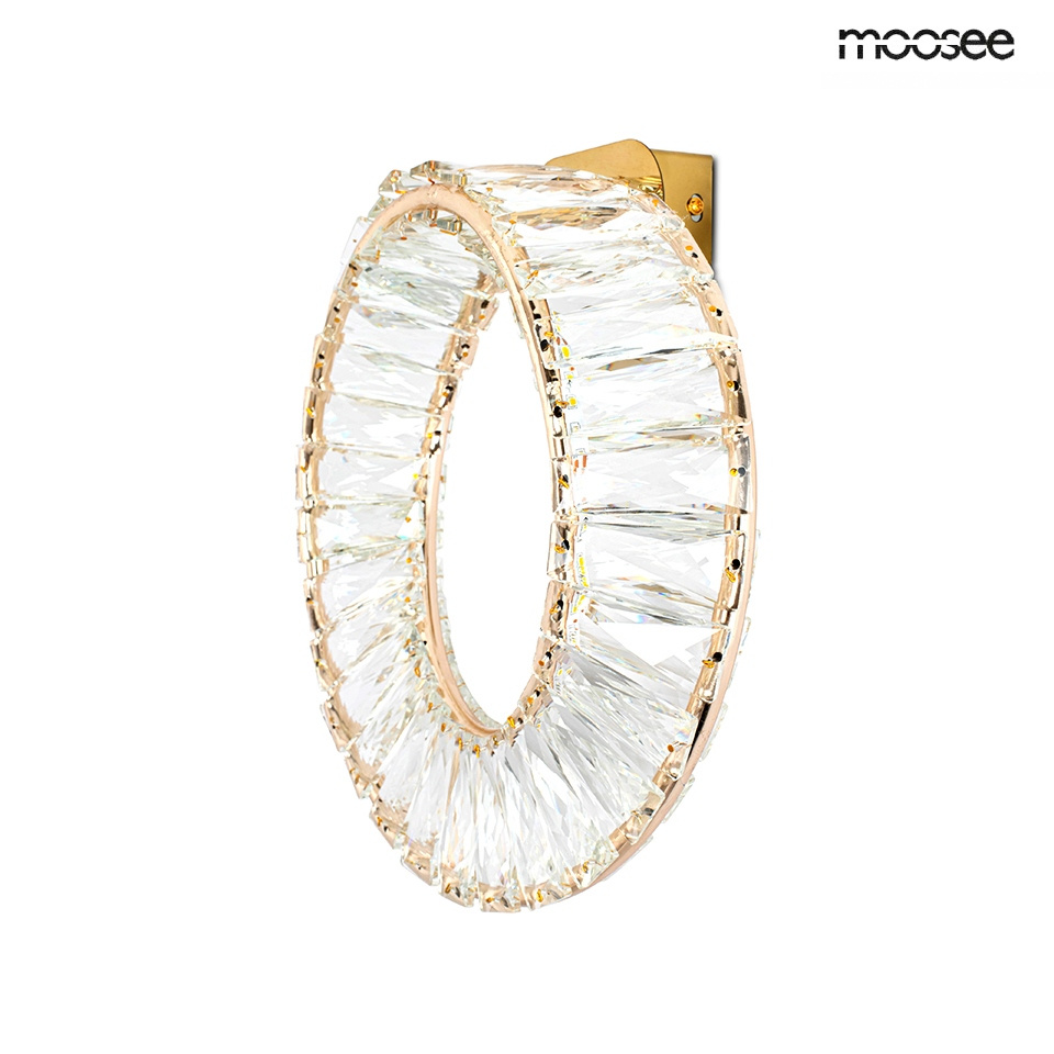 - MOOSEE lampa ścienna WAVE złota. Piękna, efektowna oprawa ścienna, która będzie również pełniła funkcję dekoracji w Twoim wnętrzu. Stworzona w wyniku połączenia stali oraz kryształów. Światło przenika przez kryształy, tworząc elegancki i luksusowy efekt.