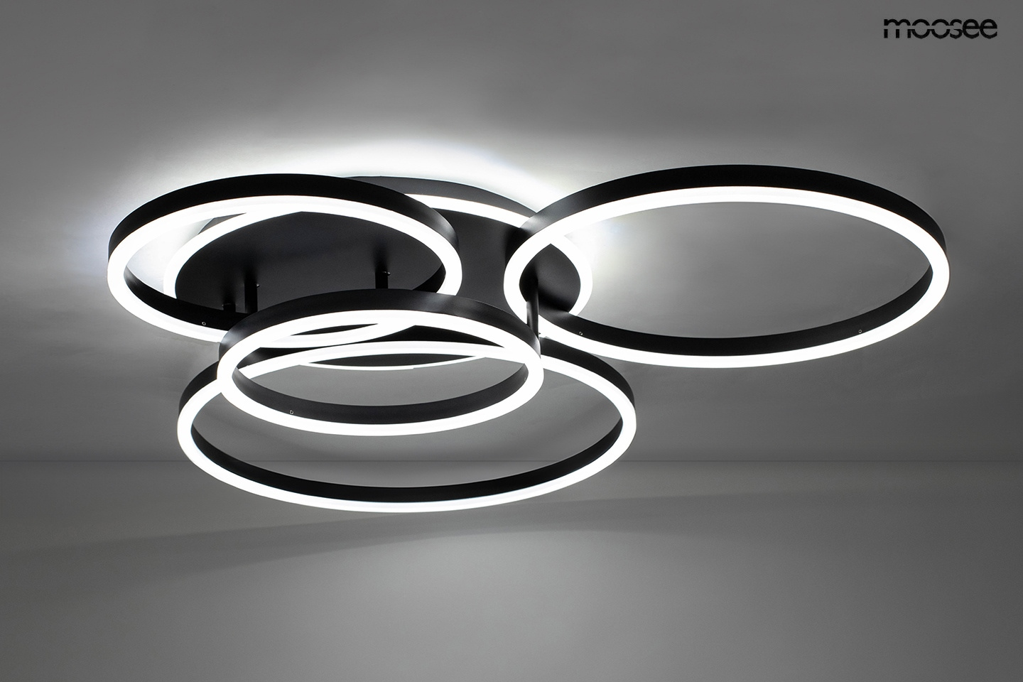 - MOOSEE lampa sufitowa / plafon RINGS 5 czarna. Poznaj kolekcję lamp Rings, które nie tylko oświetlą Twoje wnętrze, ale staną się jego najmocniejszym punktem. Pięć nowoczesnych pierścieni ze stali ułożonych w dynamicznej kompozycji przyciąga wzrok i tworzy
