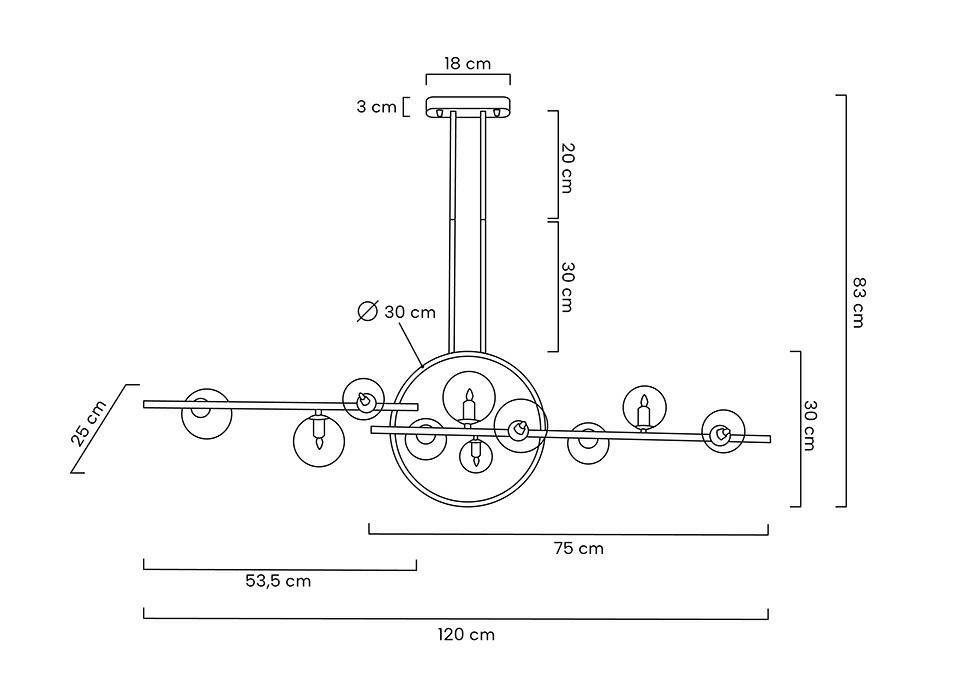 MOOSEE lampa wisząca ALURE LINE TWIN 120. Innowacyjne rozwiązanie w kategorii oświetlenia. Połączenie standardowych kloszy ze świecącą obręczą LED. Konstrukcja lampy wykonana jest z metalu w kolorze czarnym. Model ten doskonale sprawdzi się w nowoczesnych i designerskich wnętrzach użyteczności publicznej, jak również w domowym zaciszu. Kolekcja Alure pozwala na stworzenie spójnych i ciekawych aranżacji. Na kloszu mogą wystąpić pęcherzyki powietrza, które są naturalnym efektem ręcznej obróbki szkła. Światło: 10 x G9 max. 5 W (brak w zestawie) + LED 17 W / 1360 lm / 3000 K Oprawa: wys. 83 cm / szer. 120 cm / gł. 25 cm Klosz: wys. 30 cm / szer. 120 cm / gł. 25 Klosz LED: śr. 30 cm Szklane klosze: śr. 4 x 11 cm, 5 x 8,5 cm, 1 x 5,5 cm Ramiona poziome: dł. .75 cm / dł. 53,5 cm Regulacja wysokości: 1 x 30 cm / 1 x 20 cm Montatura: wys. 3 cm / szer. 18 cm / gł. 5 cm Montaż: instalacja sufitowa Waga netto: 4 kg Wymiary opakowania: 127 cm / 42 cm / 20 cm.