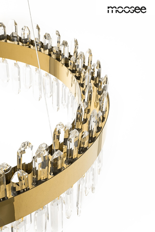 • MOOSEE lampa wisząca AMIRA 80 złota Ekskluzywna i elegancka oprawa, która udekoruje nowoczesne wnętrza w stylu Glamour. Stalowa obręcz w złotym kolorze z dodatkiem błyszczących kryształów tworzy niesamowity efekt wizualny, który przyciąga wzrok. Złoty kol