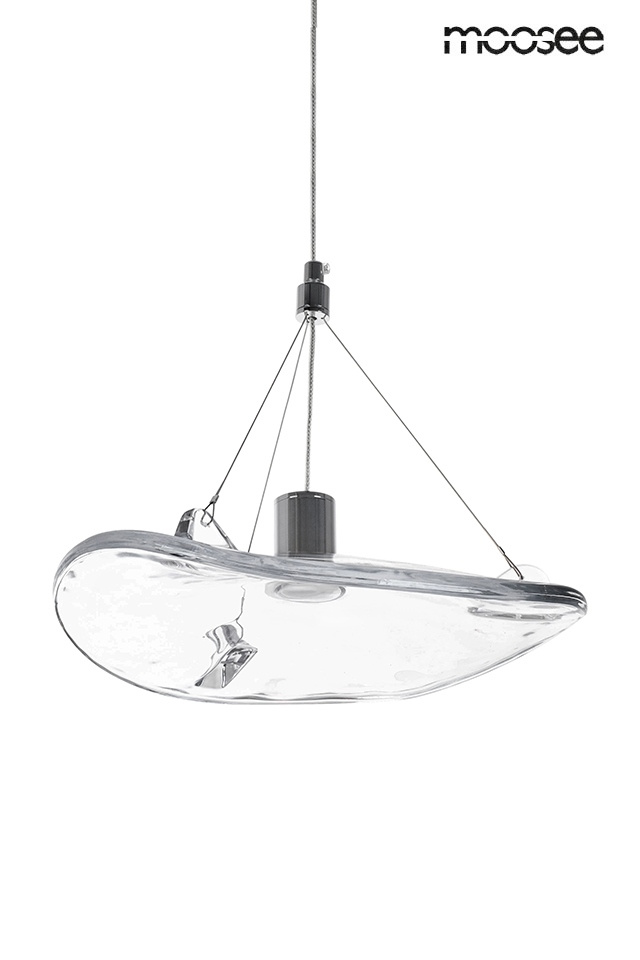 - MOOSEE lampa wisząca AQUA 25. Nowoczesna, przezroczysta oprawa, która ozdobi nie jedno wnętrze swoim oryginalnym designem. Piękny, szklany klosz doskonale rozprasza światło. Nieregularny kształt dodaje ciekawego charakteru oraz sprawia, że każdy egzemplar