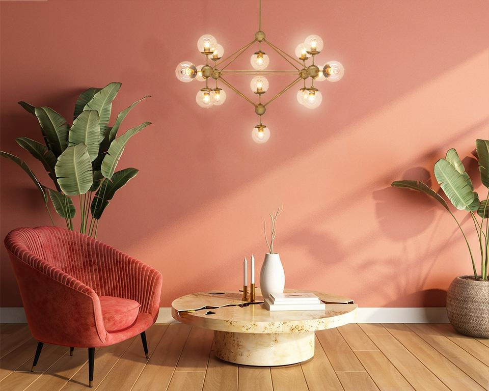- MOOSEE lampa wisząca ASTRIFERO 15. Konstrukcja lampy wykonana została z metalu w kolorze złotym. Całość dopełnia 15 okrągłych, szklanych kloszy o bursztynowym kolorze. Do regulacji wysokości oprawy służą 3 metalowe, wkręcane pręty o długościach 2 x 50 cm