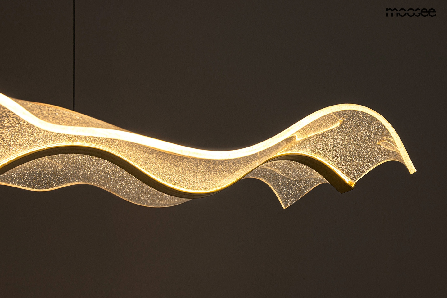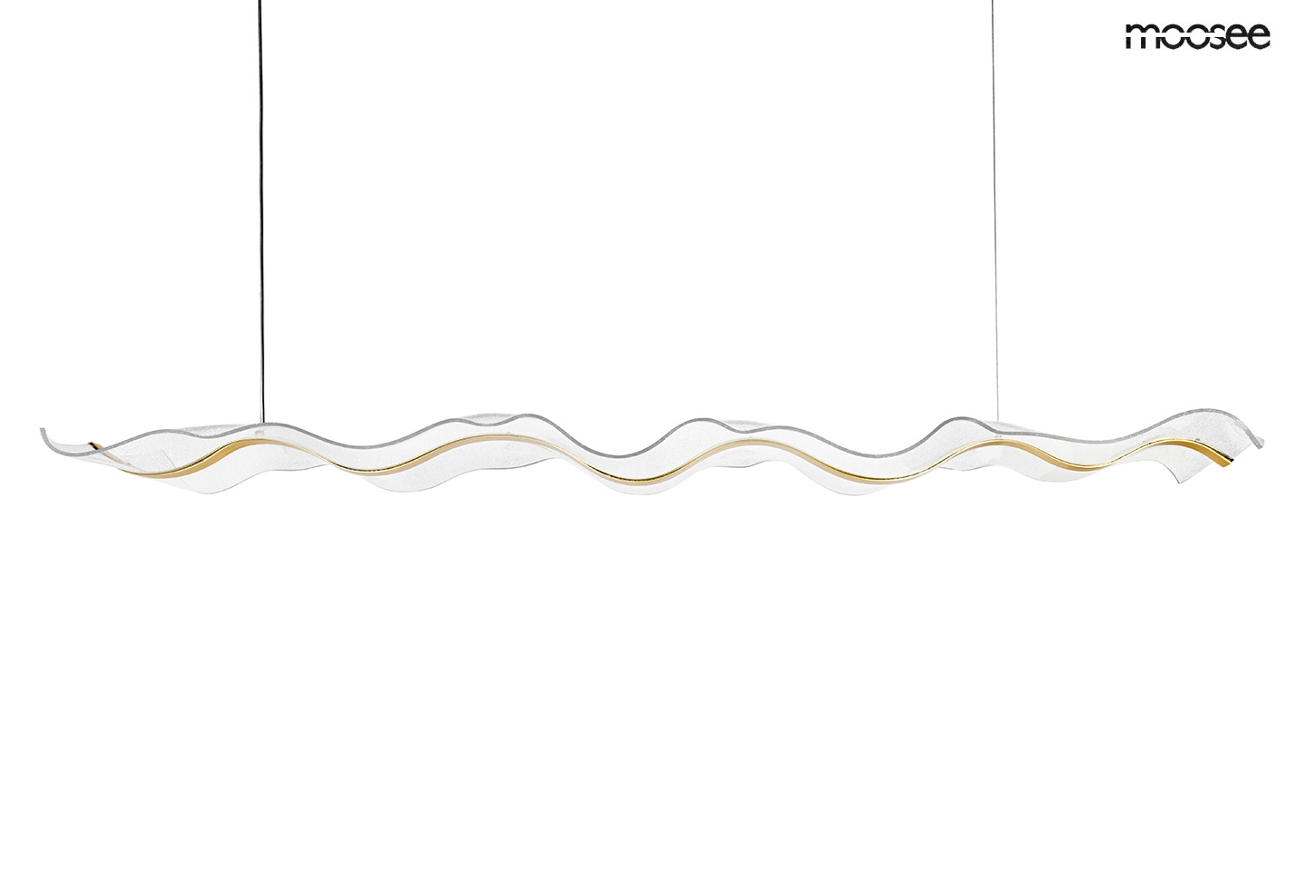 - MOOSEE lampa wisząca BREATH 180 złota. Efektowny element wystroju wnętrz, który zachwyca swoim designem i jakością wykonania. Nierówne, designerskie linie wykonane ze stali o złotym wykończeniu w połączeniu z akrylem nadają prosty, nowoczesny wygląd. Dost