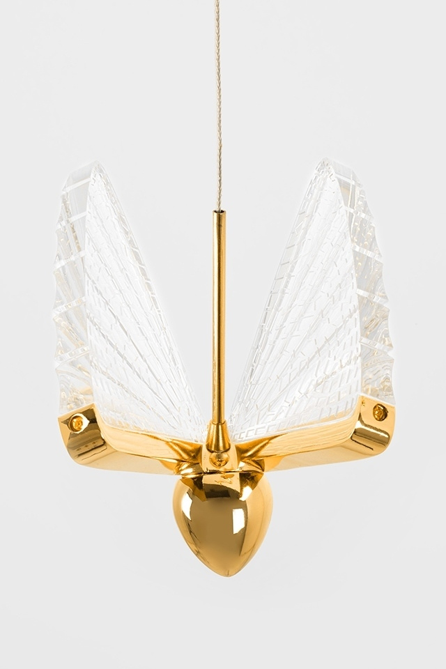 - Lampa wisząca BUTTERFLY DISC 5 złota. Designerski motyw lampy wykonany z metalu w kolorze złotym z transparentnymi, akrylowymi skrzydłami. Składa się z trzech lamp Butterly S i dwóch lamp Butterlfy L. Na regulowanej lince mocującej każdej z lamp znajduje