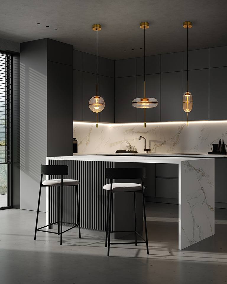 Snop światła o ciepłej barwie skierowany jest do dołu, oświetlając wnętrze klosza. Dzięki czemu powstaje bardzo przyjemny i elegancki efekt.