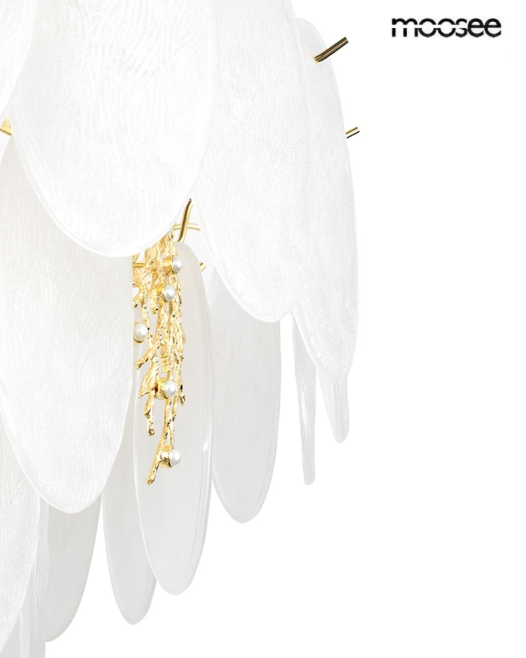 - MOOSEE lampa wisząca CLARA 60 złota. Wyjątkowa oprawa, łącząca elegancję z dekoracyjnym efektem. Wykonana z metalu i szkła, łączy trwałość z wyrafinowanym designem. Oryginalna i artystyczna forma, nawiązująca do opadających liści, tworzy w pomieszczeniu w