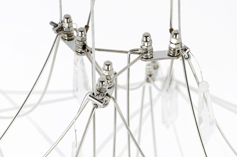- Lampa Constelation 77. Konstrukcja lampy wykonana została ze stali szczotkowanej. Metalowa pajęczyna, połączona z ledowymi źródłami światła tworzy wyjątkowo elegancką konstrukcję. Całość została wykończona dekoracyjnymi kryształkami. Światło: moduł LED 66