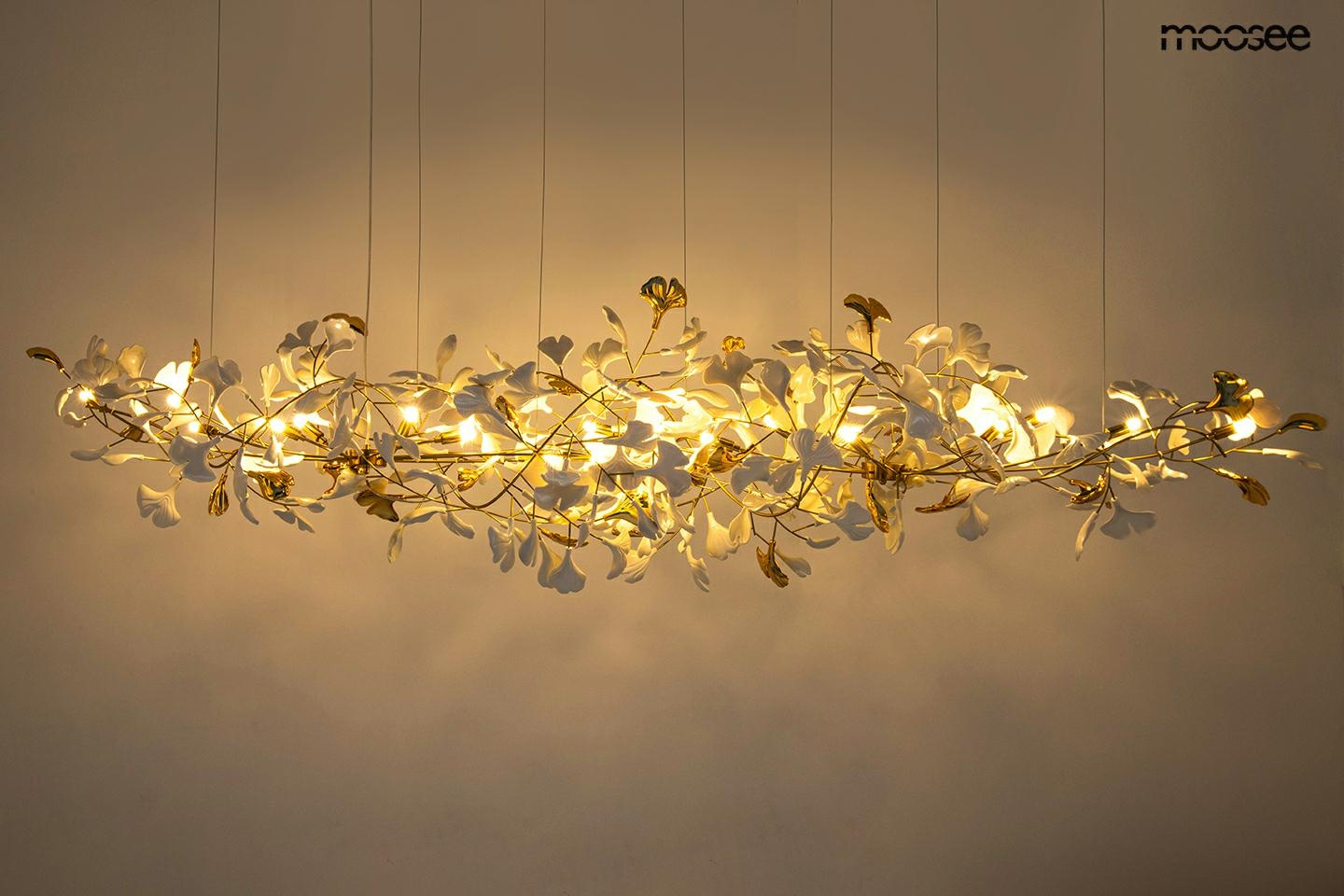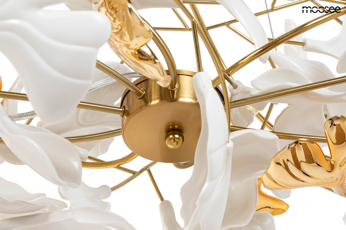 - MOOSEE lampa wisząca FLORA 250 złota. Prawdziwa poezja w formie oświetlenia, zainspirowana bujną naturą i roślinnością. Główną ozdobę pełnią tu subtelne klosze z tworzywa sztucznego, przypominające płatki kwiatu. Całość umieszczono na eleganckim długim zł