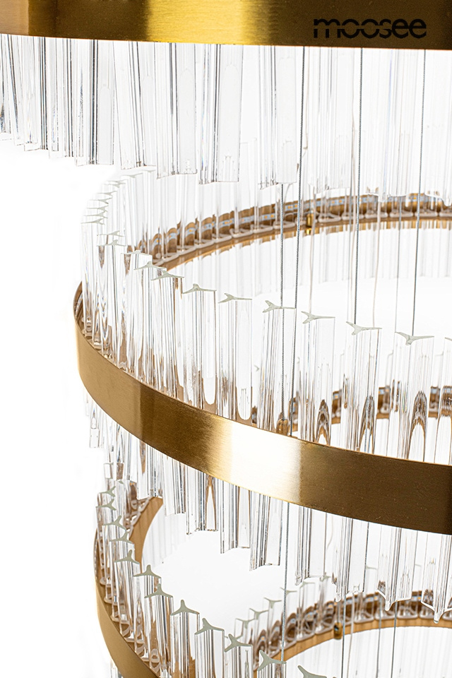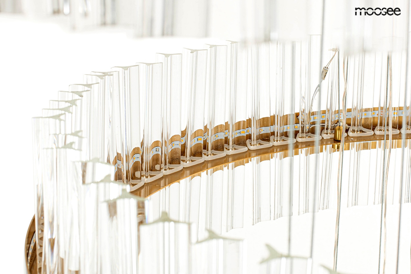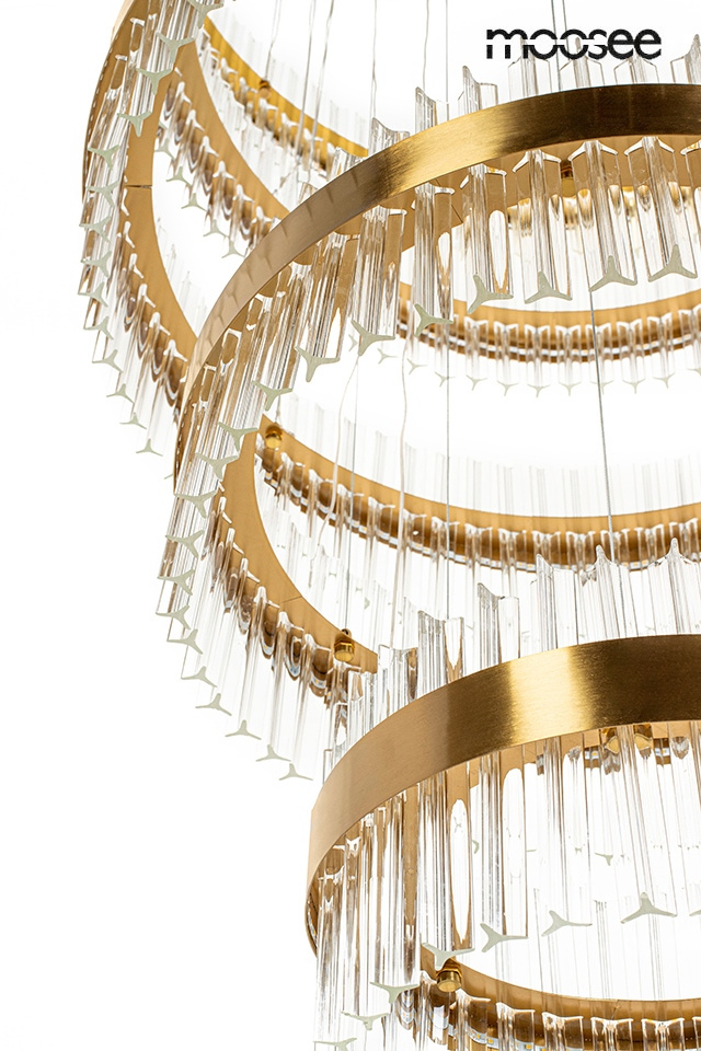 - MOOSEE lampa wisząca GHIA 5 złota. Luksusowa, imponująca oprawa o nowoczesnym, wykwintnym designie. Spektakularny efekt tworzy 5 stalowych ringów wykończonych w szykownym złotym kolorze, które wzbogacono szklanymi, przezroczystymi kloszami. Okręgi o różny