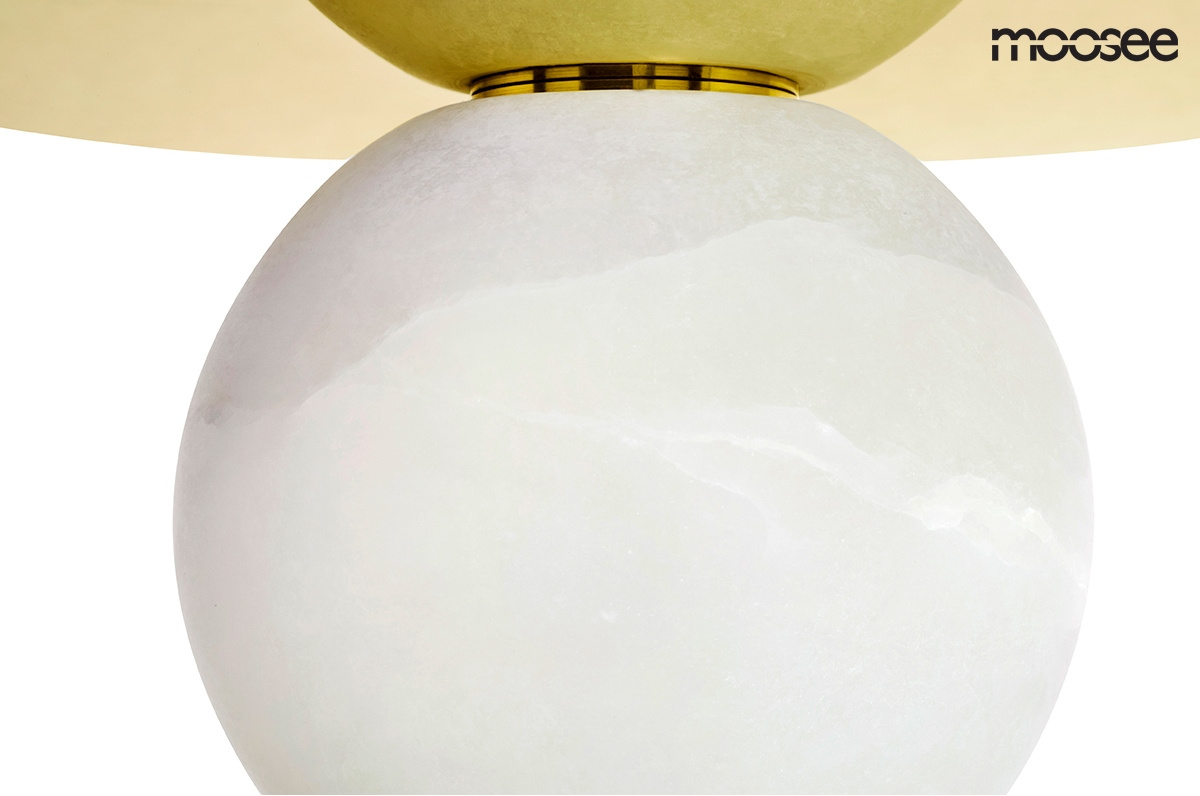 - Lampa wisząca HALO od marki MOOSEE. Wykonana została z połączenia stali nierdzewnej w złotym kolorze i kulistego klosza wykonanego z alabastru. Klosz wykonany z mlecznego alabastru, skrywający Ledowe źródło światła. Został umieszczony na złotym dysku, któ