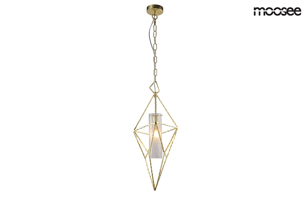 - Lampa wisząca HAVANA M od marki MOOSEE. Geometryczną konstrukcję wykonano z połączenia metalu w kolorze złotym i szklanego klosza. Klosz otoczony jest geometrycznym stelażem. Całość została umieszczona na złotej podsufitce, eleganckim łańcuszku i transpar