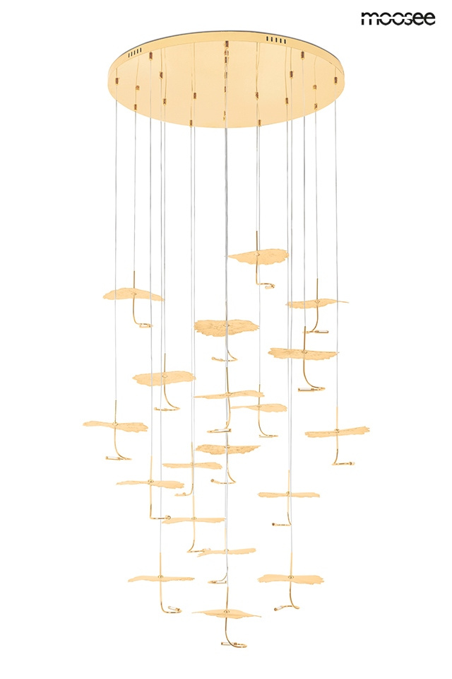 - MOOSEE lampa wisząca LEAFS DISC złota. Zjawiskowa i wyróżniająca się oprawa, która doda nowoczesnego, a zarazem luksusowego akcentu do Twojego salonu. Poprzez zawieszenie kloszy kaskadowo otrzymujemy spektakularny efekt przypominający taniec liści na wiet