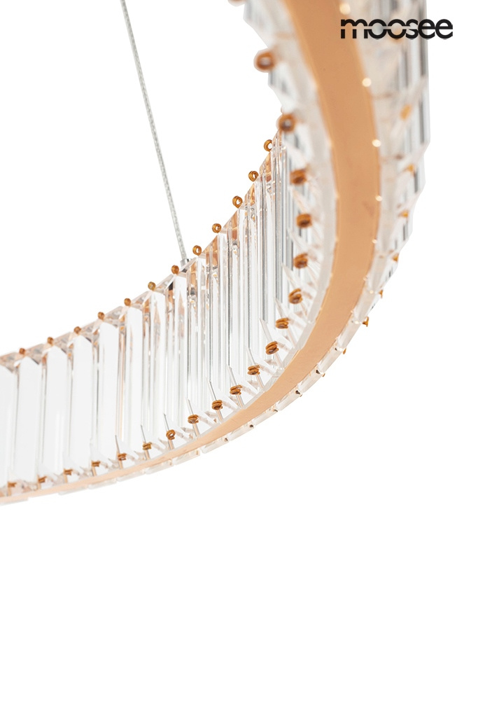 - MOOSEE lampa wisząca LIBERTY 40 złota. Ekskluzywna i elegancka oprawa, która z powodzeniem ozdobi wnętrza klasyczne, nowoczesne oraz glamour. Kryształowe szkło zamocowane po obu stronach obręczy w niezwykły sposób rozprasza strumień światła. Złoty kolor d