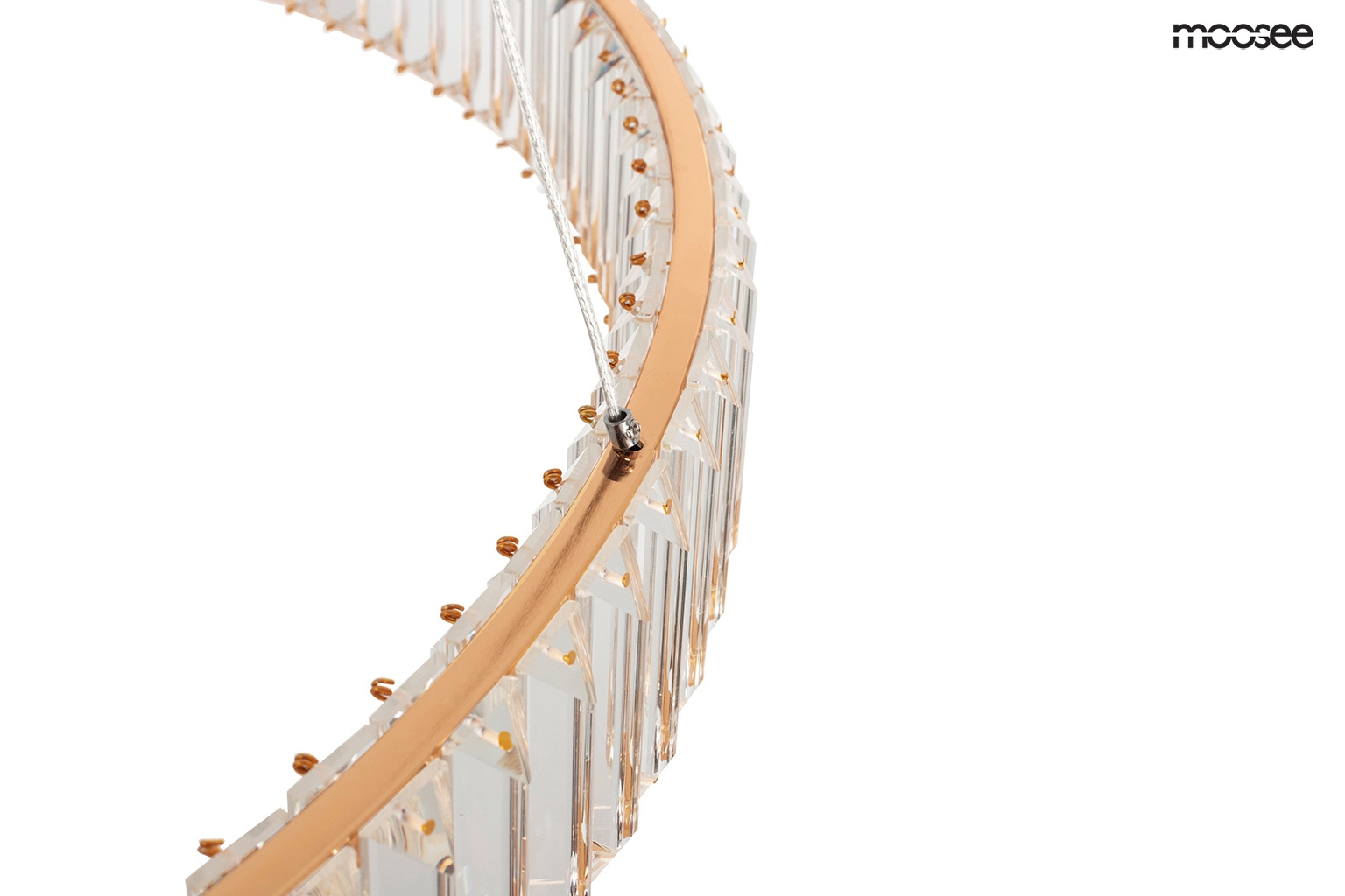 - MOOSEE lampa wisząca LIBERTY 60 złota. Ekskluzywna i elegancka oprawa, która z powodzeniem ozdobi wnętrza klasyczne, nowoczesne oraz glamour. Kryształowe szkło zamocowane po obu stronach obręczy w niezwykły sposób rozprasza strumień światła. Złoty kolor d