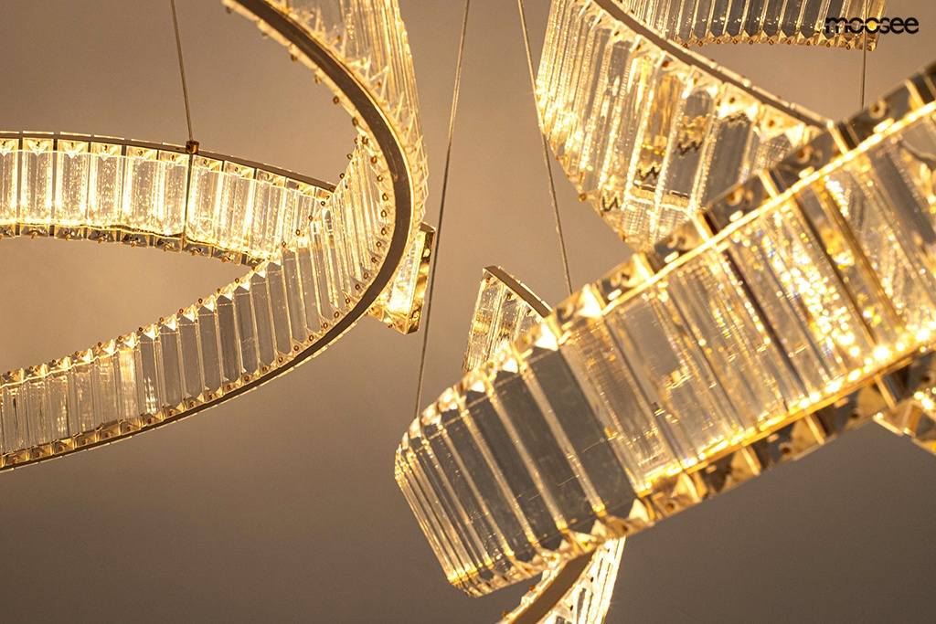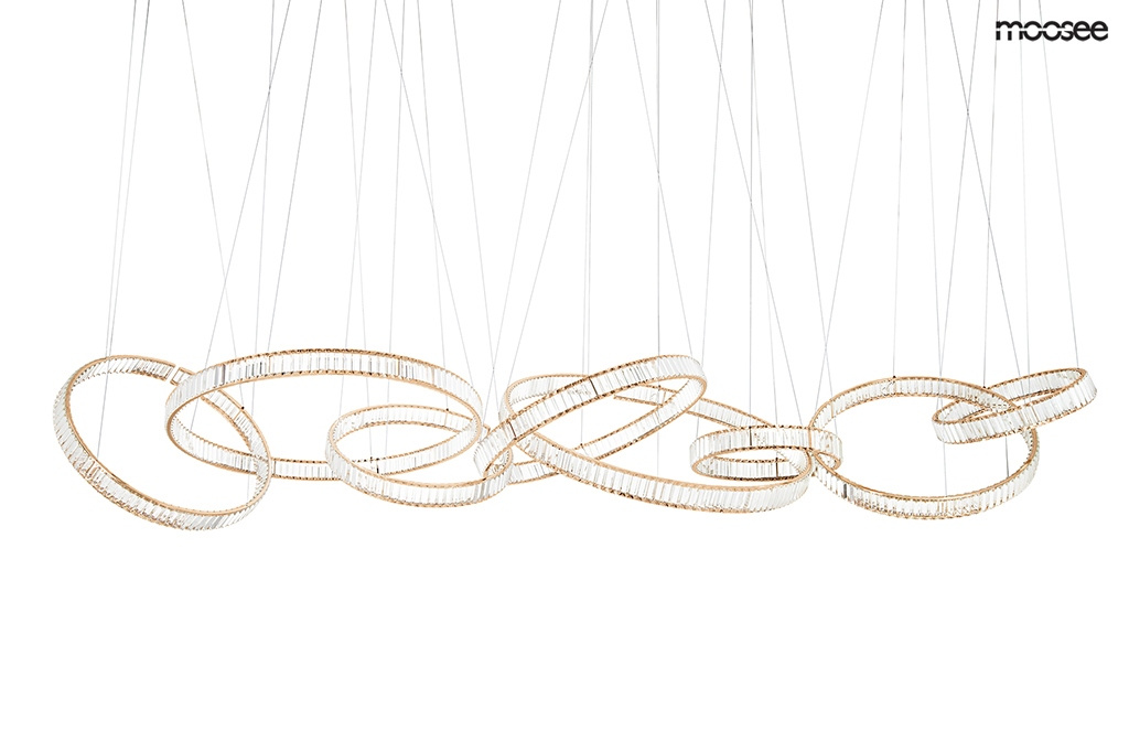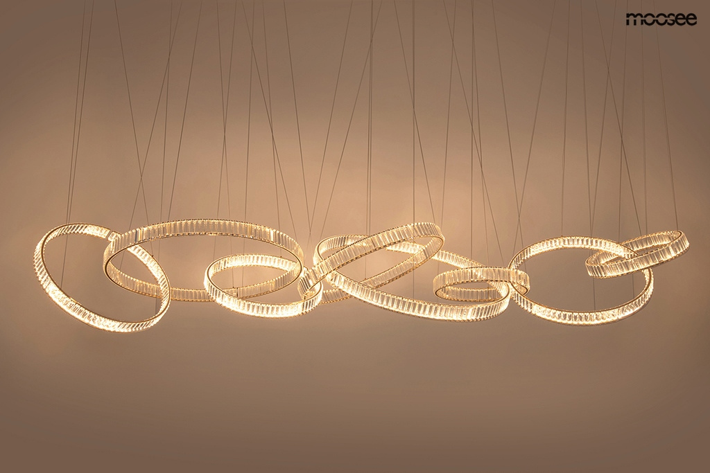 - MOOSEE lampa wisząca LIBERTY LINE 8 złota. Ekskluzywna i elegancka oprawa, która z powodzeniem ozdobi wnętrza klasyczne, nowoczesne oraz glamour. Kryształowe szkło zamocowane po obu stronach obręczy w niezwykły sposób rozprasza strumień światła. Złoty kol