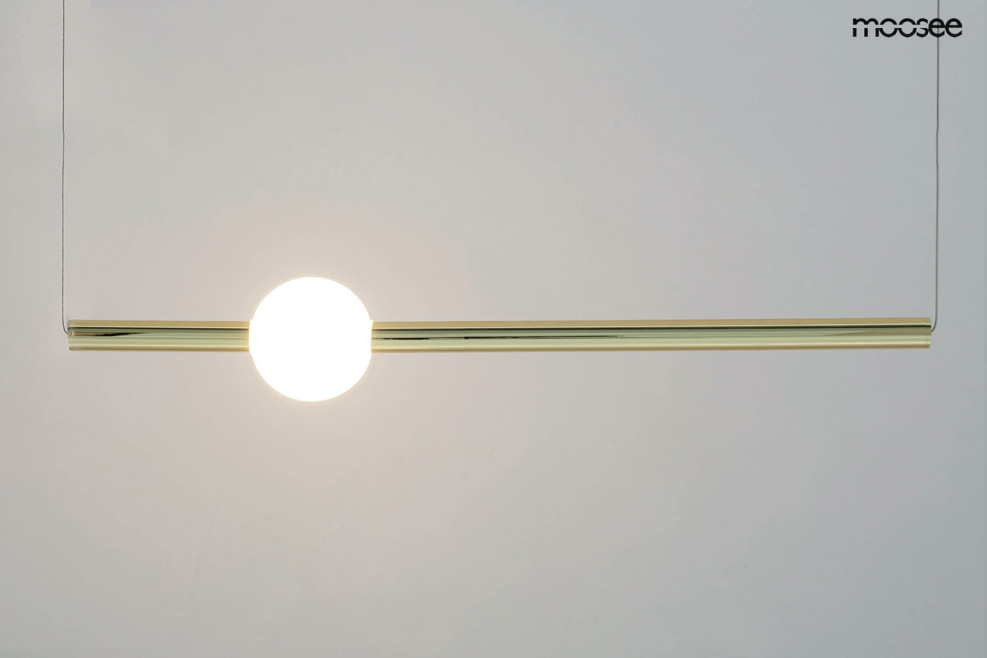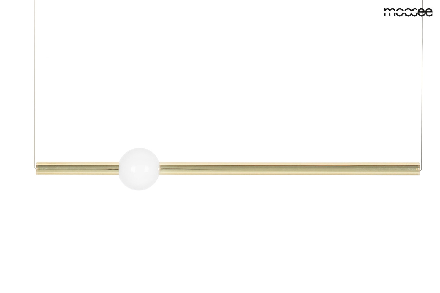 - MOOSEE lampa wisząca LIBRA 90 ON złota. Została wykonana z połączenia stali nierdzewnej w stonowanym złotym kolorze i szklanej błyszczącej kuli. Biały klosz o średnicy 10 cm umieszczono na podłużnej konstrukcji zawieszonej na lince i transparentnym przewo