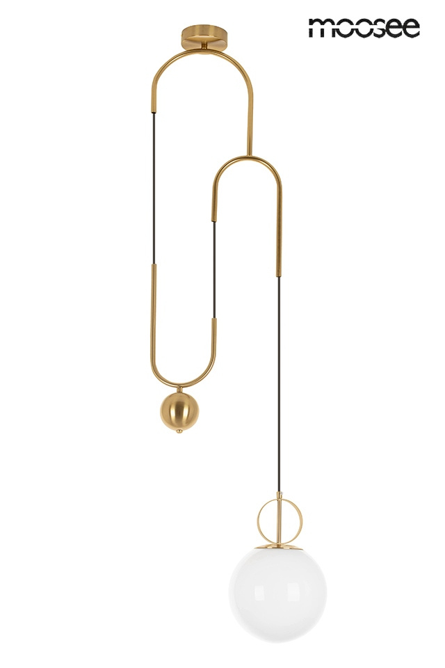 - MOOSEE lampa wisząca LIFT złota. Propozycja elegancka i klasyczna, a zarazem nieco ekstrawagancka, dzięki dekoracyjnym elementom przypominającym obciążniki. Została wykonana z metalu w złotym kolorze oraz mlecznego szkła, tak by zapewnić wysoką trwałość i