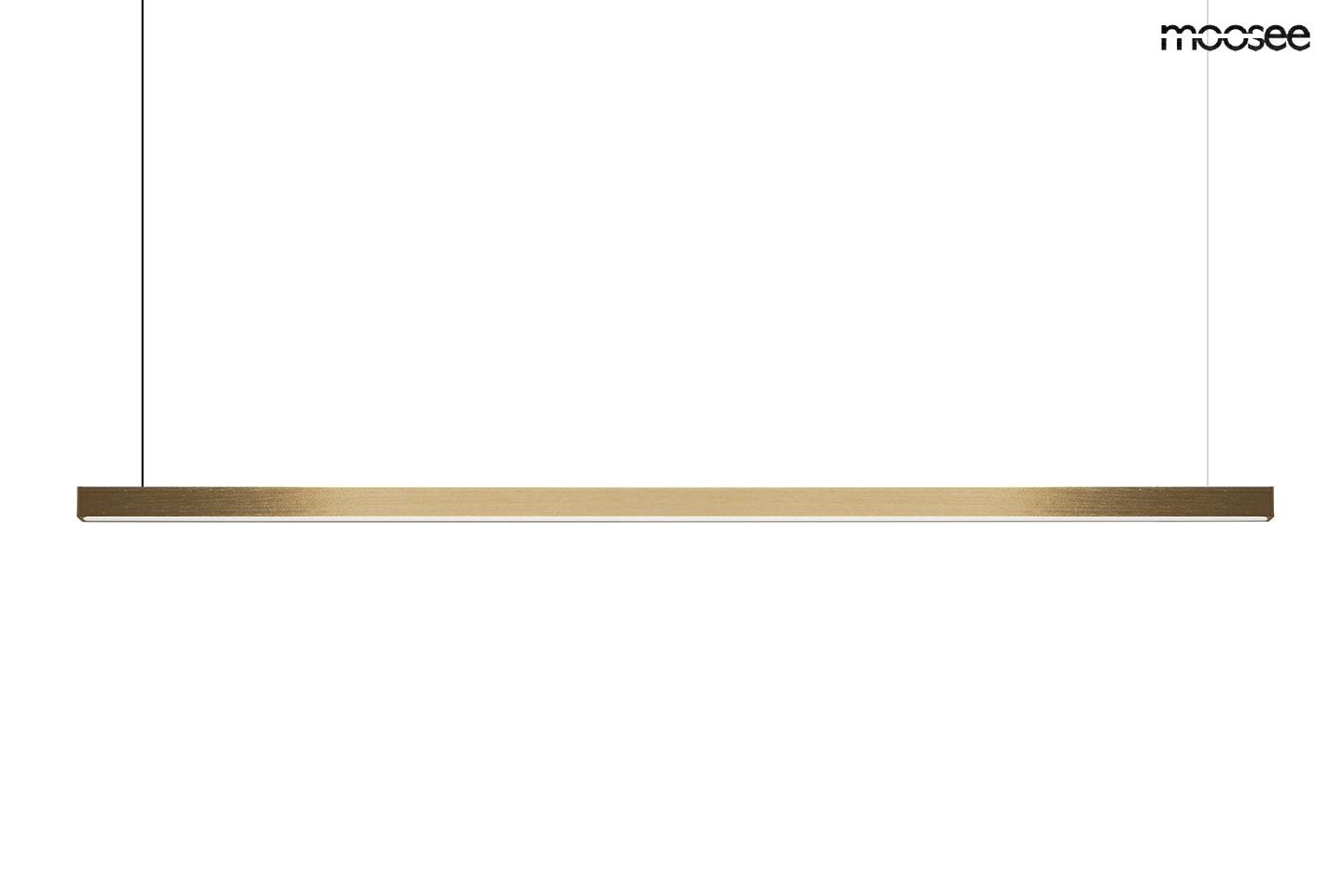 - MOOSEE lampa wisząca LINUS 120 złota. Wykonana ze stali i aluminium w kolorze złotym. Odcień lampy tworzy efekt ombre. Led o ciepłej barwie umieszczony jest na całej długości, zapewniając odpowiednie oświetlenie. Prosta, a zarazem nowoczesna oprawa będzie