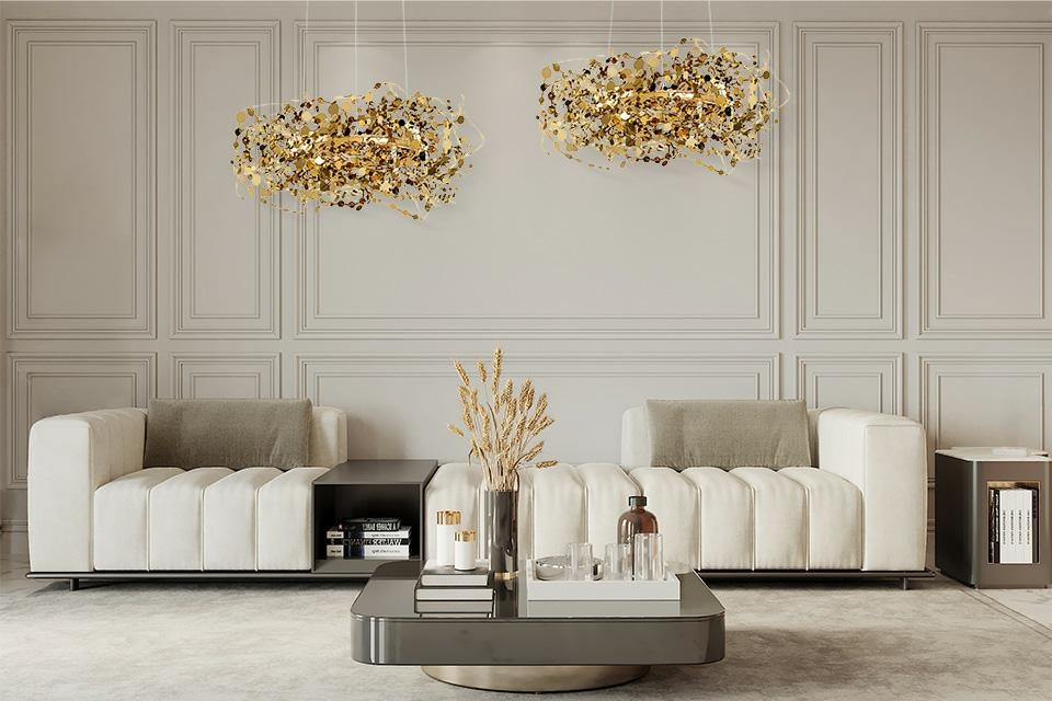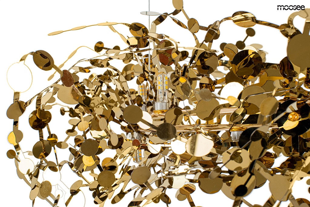 - MOOSEE lampa wisząca MONETE 60 złota. Nowoczesna, luksusowa oprawa, która przykuwa uwagę i pobudza kreatywność. To wspaniały sposób na awangardowe oświetlenie salonu bądź jadalni. Konstrukcję lampy wykonano ze stali w błyszczącym złotym odcieniu. Zbiór kl